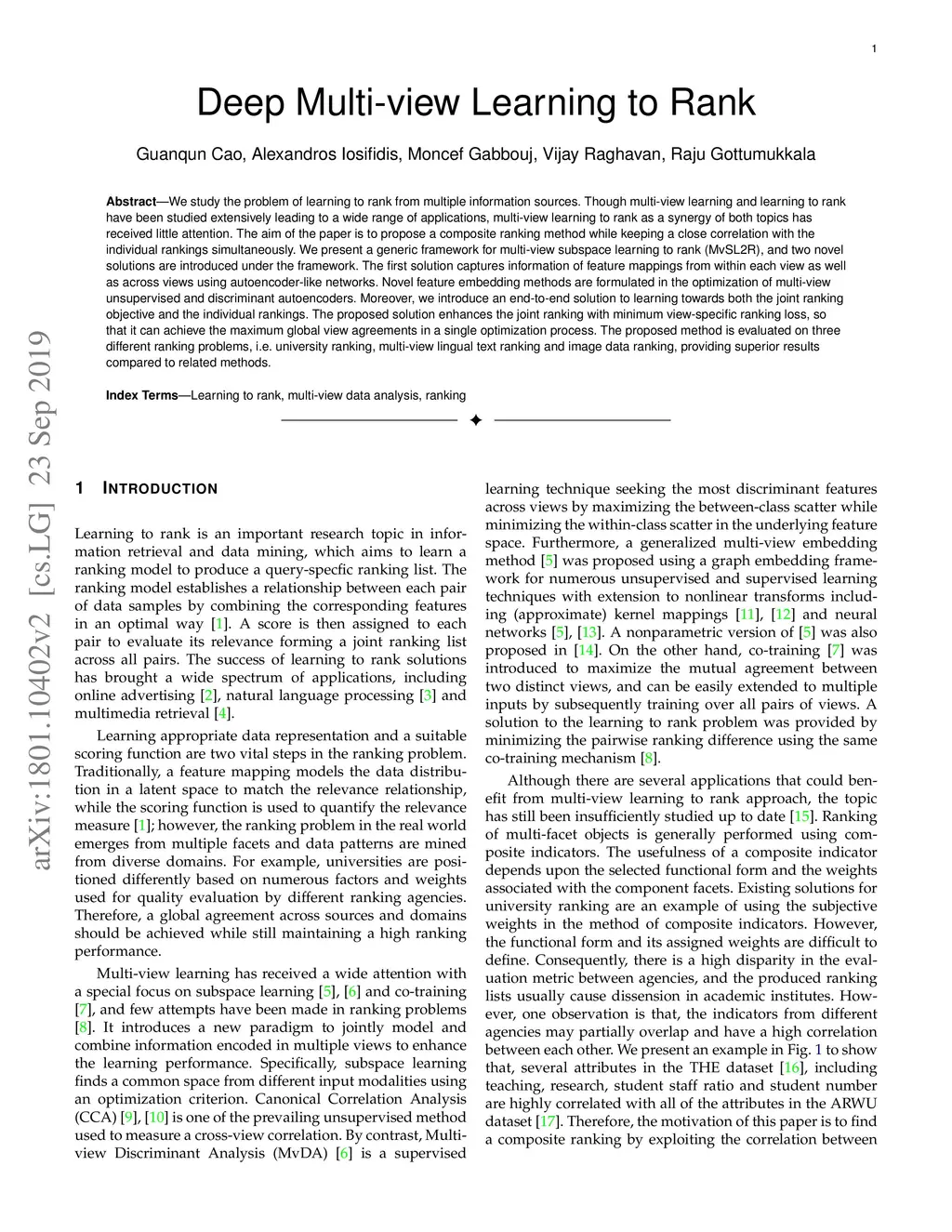 We study the problem of learning to rank from multiple information sources. Though multi-view learning and learning to rank have been studied extensively leading to a wide range of applications, multi-view learning to rank as a synergy of both topics has received little attention. The aim of the paper is to propose a composite ranking method while keeping a close correlation with the individual rankings simultaneously. We present a generic framework for multi-view subspace learning to rank (MvSL2R), and two novel solutions are introduced under the framework. The first solution captures information of feature mappings from within each view as well as across views using autoencoder-like networks. Novel feature embedding methods are formulated in the optimization of multi-view unsupervised and discriminant autoencoders. Moreover, we introduce an end-to-end solution to learning towards both the joint ranking objective and the individual rankings. The proposed solution enhances the joint ranking with minimum view-specific ranking loss, so that it can achieve the maximum global view agreements in a single optimization process. The proposed method is evaluated on three different ranking problems, i.e. university ranking, multi-view lingual text ranking and image data ranking, providing superior results compared to related methods.
