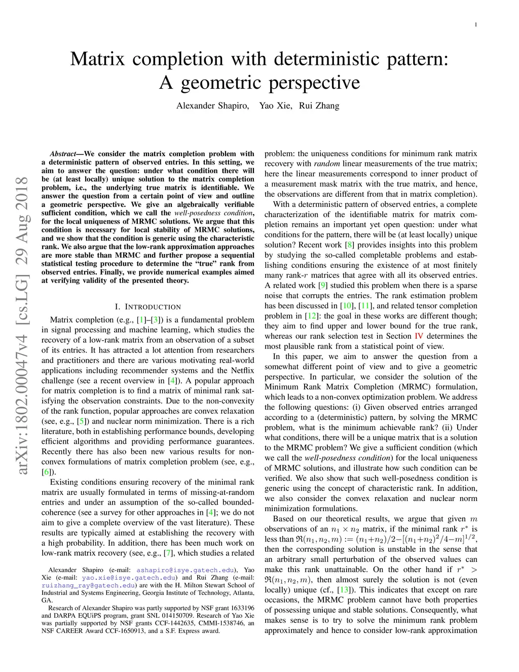 We consider the matrix completion problem with a deterministic pattern of observed entries and aim to find conditions such that there will be (at least locally) unique solution to the non-convex Minimum Rank Matrix Completion (MRMC) formulation. We answer the question from a somewhat different point of view and to give a geometric perspective. We give a sufficient and "almost necessary" condition (which we call the well-posedness condition) for the local uniqueness of MRMC solutions and illustrate with some special cases where such condition can be verified. We also consider the convex relaxation and nuclear norm minimization formulations. Then we argue that the low-rank approximation approaches are more stable than MRMC and further propose a sequential statistical testing procedure to determine the rank of the matrix from observed entries. Finally, numerical examples verified the validity of our theory.