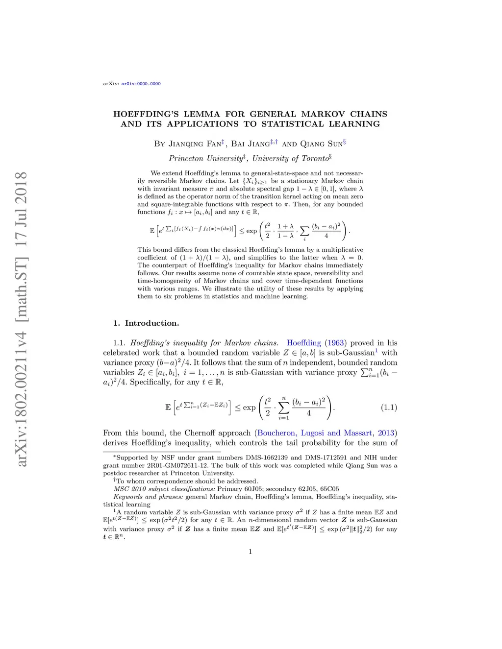 We establish the counterpart of Hoeffding's lemma for Markov dependent random variables. Specifically, if a stationary Markov chain with invariant measure admits an -spectral gap , then for any bounded functions , the sum of is sub-Gaussian with variance proxy . The counterpart of Hoeffding's inequality immediately follows. Our results assume none of reversibility, countable state space and time-homogeneity of Markov chains. They are optimal in terms of the multiplicative coefficient , and cover Hoeffding's lemma and inequality for independent random variables as special cases with . We illustrate the utility of these results by applying them to six problems in statistics and machine learning. They are linear regression, lasso regression, sparse covariance matrix estimation with Markov-dependent samples; Markov chain Monte Carlo estimation; respondence driven sampling; and multi-armed bandit problems with Markovian rewards.