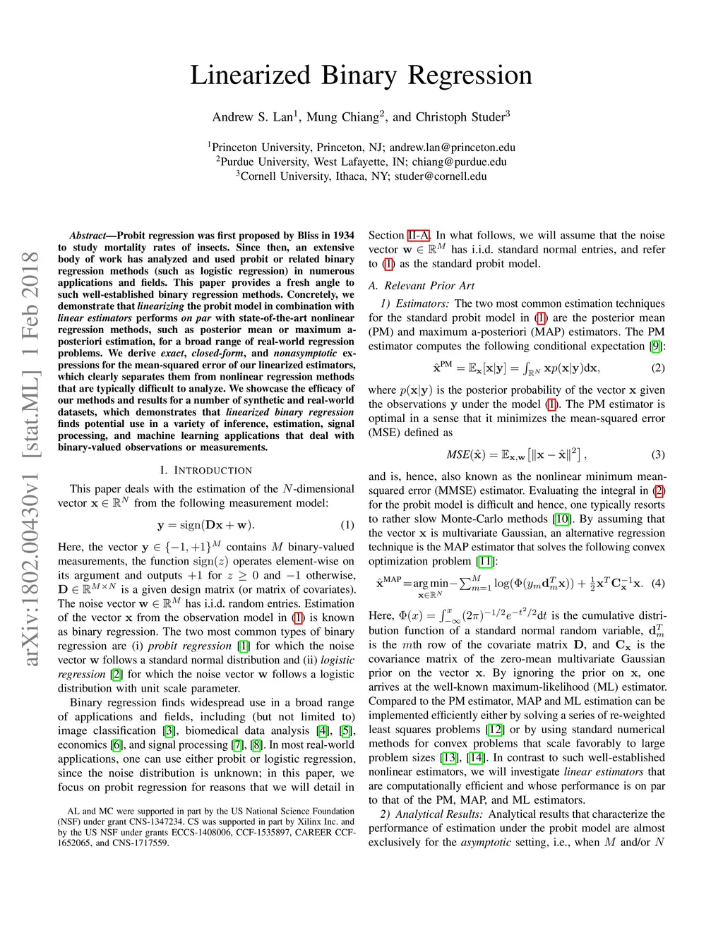 Probit regression was first proposed by Bliss in 1934 to study mortality rates of insects. Since then, an extensive body of work has analyzed and used probit or related binary regression methods (such as logistic regression) in numerous applications and fields. This paper provides a fresh angle to such well-established binary regression methods. Concretely, we demonstrate that linearizing the probit model in combination with linear estimators performs on par with state-of-the-art nonlinear regression methods, such as posterior mean or maximum aposteriori estimation, for a broad range of real-world regression problems. We derive exact, closed-form, and nonasymptotic expressions for the mean-squared error of our linearized estimators, which clearly separates them from nonlinear regression methods that are typically difficult to analyze. We showcase the efficacy of our methods and results for a number of synthetic and real-world datasets, which demonstrates that linearized binary regression finds potential use in a variety of inference, estimation, signal processing, and machine learning applications that deal with binary-valued observations or measurements.