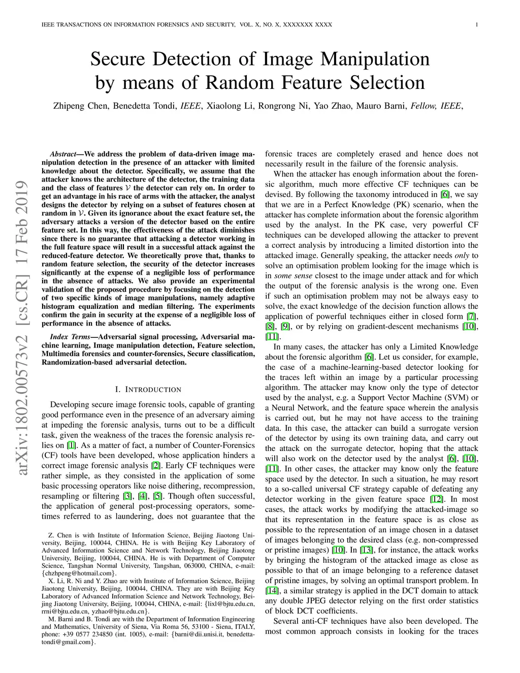We address the problem of data-driven image manipulation detection in the presence of an attacker with limited knowledge about the detector. Specifically, we assume that the attacker knows the architecture of the detector, the training data and the class of features V the detector can rely on. In order to get an advantage in his race of arms with the attacker, the analyst designs the detector by relying on a subset of features chosen at random in V. Given its ignorance about the exact feature set, the adversary attacks a version of the detector based on the entire feature set. In this way, the effectiveness of the attack diminishes since there is no guarantee that attacking a detector working in the full feature space will result in a successful attack against the reduced-feature detector. We theoretically prove that, thanks to random feature selection, the security of the detector increases significantly at the expense of a negligible loss of performance in the absence of attacks. We also provide an experimental validation of the proposed procedure by focusing on the detection of two specific kinds of image manipulations, namely adaptive histogram equalization and median filtering. The experiments confirm the gain in security at the expense of a negligible loss of performance in the absence of attacks.