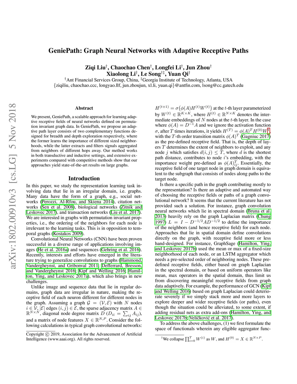 GeniePath: Graph Neural Networks with Adaptive Receptive Paths