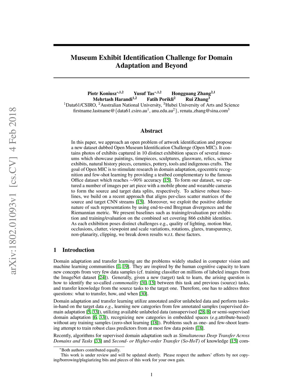 In this paper, we approach an open problem of artwork identification and propose a new dataset dubbed Open Museum Identification Challenge (Open MIC). It contains photos of exhibits captured in 10 distinct exhibition spaces of several museums which showcase paintings, timepieces, sculptures, glassware, relics, science exhibits, natural history pieces, ceramics, pottery, tools and indigenous crafts. The goal of Open MIC is to stimulate research in domain adaptation, egocentric recognition and few-shot learning by providing a testbed complementary to the famous Office dataset which reaches 90% accuracy. To form our dataset, we captured a number of images per art piece with a mobile phone and wearable cameras to form the source and target data splits, respectively. To achieve robust baselines, we build on a recent approach that aligns per-class scatter matrices of the source and target CNN streams [15]. Moreover, we exploit the positive definite nature of such representations by using end-to-end Bregman divergences and the Riemannian metric. We present baselines such as training/evaluation per exhibition and training/evaluation on the combined set covering 866 exhibit identities. As each exhibition poses distinct challenges e.g., quality of lighting, motion blur, occlusions, clutter, viewpoint and scale variations, rotations, glares, transparency, non-planarity, clipping, we break down results w.r.t. these factors.