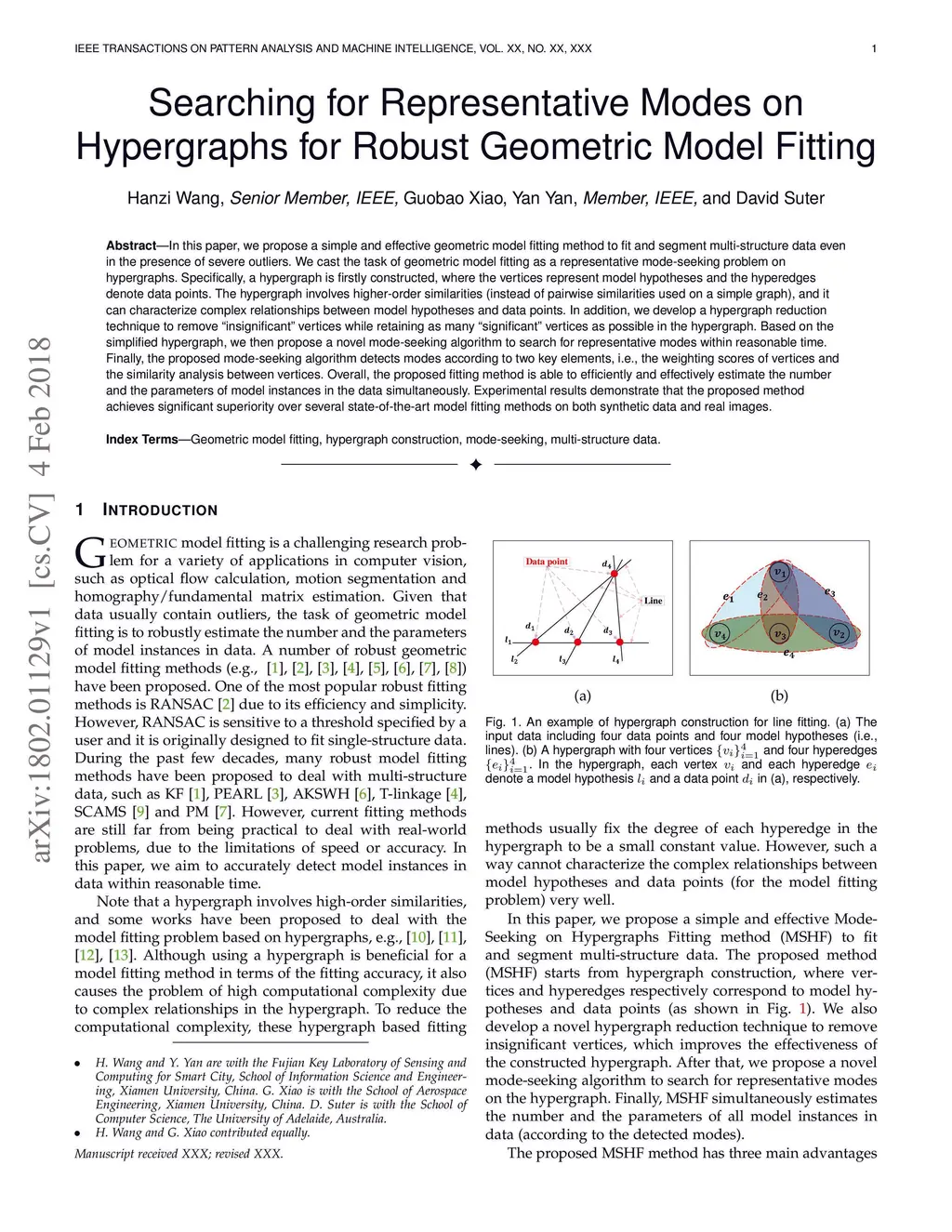 In this paper, we propose a simple and effective {geometric} model fitting method to fit and segment multi-structure data even in the presence of severe outliers. We cast the task of geometric model fitting as a representative mode-seeking problem on hypergraphs. Specifically, a hypergraph is firstly constructed, where the vertices represent model hypotheses and the hyperedges denote data points. The hypergraph involves higher-order similarities (instead of pairwise similarities used on a simple graph), and it can characterize complex relationships between model hypotheses and data points. {In addition, we develop a hypergraph reduction technique to remove "insignificant" vertices while retaining as many "significant" vertices as possible in the hypergraph}. Based on the {simplified hypergraph, we then propose a novel mode-seeking algorithm to search for representative modes within reasonable time. Finally, the} proposed mode-seeking algorithm detects modes according to two key elements, i.e., the weighting scores of vertices and the similarity analysis between vertices. Overall, the proposed fitting method is able to efficiently and effectively estimate the number and the parameters of model instances in the data simultaneously. Experimental results demonstrate that the proposed method achieves significant superiority over {several} state-of-the-art model fitting methods on both synthetic data and real images.