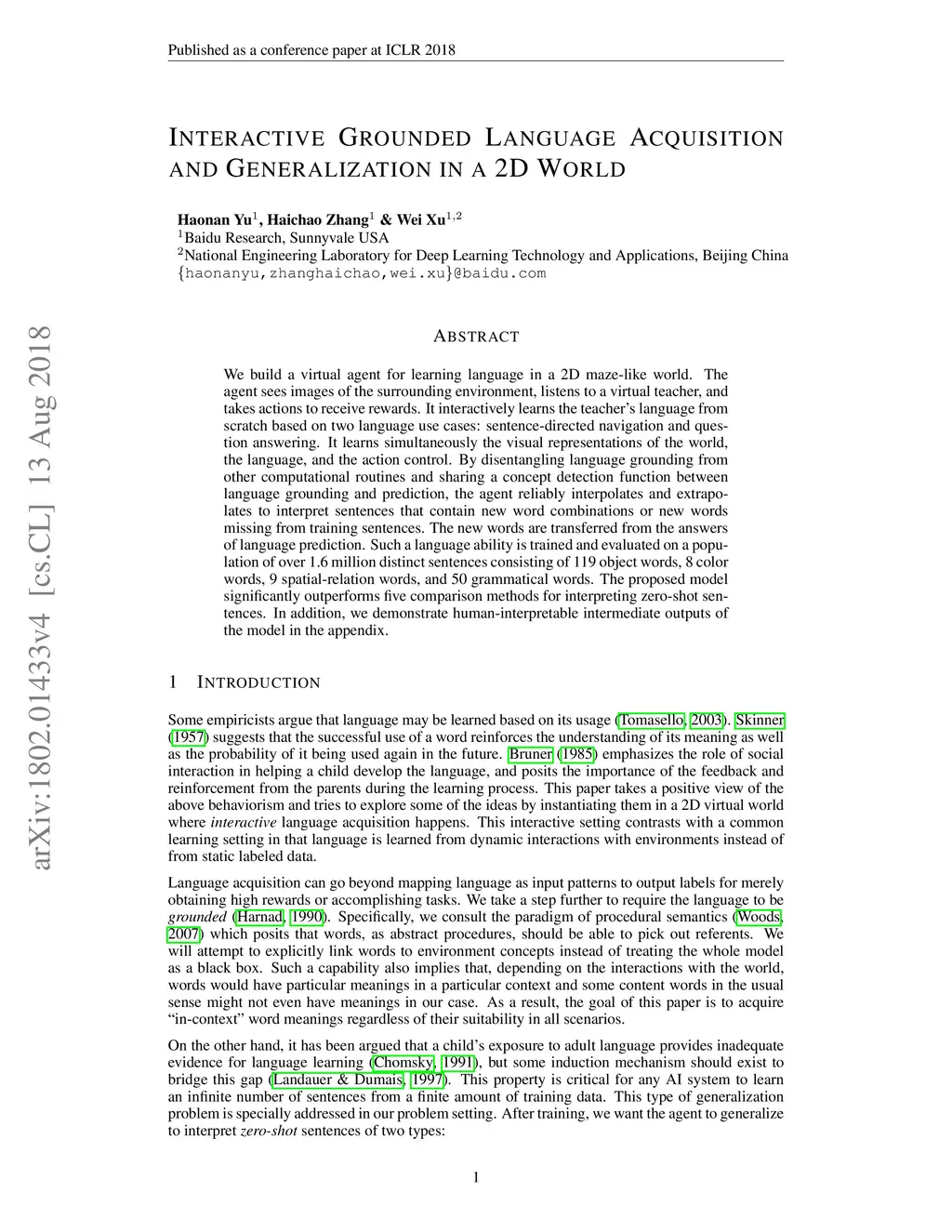 We build a virtual agent for learning language in a 2D maze-like world. The agent sees images of the surrounding environment, listens to a virtual teacher, and takes actions to receive rewards. It interactively learns the teacher's language from scratch based on two language use cases: sentence-directed navigation and question answering. It learns simultaneously the visual representations of the world, the language, and the action control. By disentangling language grounding from other computational routines and sharing a concept detection function between language grounding and prediction, the agent reliably interpolates and extrapolates to interpret sentences that contain new word combinations or new words missing from training sentences. The new words are transferred from the answers of language prediction. Such a language ability is trained and evaluated on a population of over 1.6 million distinct sentences consisting of 119 object words, 8 color words, 9 spatial-relation words, and 50 grammatical words. The proposed model significantly outperforms five comparison methods for interpreting zero-shot sentences. In addition, we demonstrate human-interpretable intermediate outputs of the model in the appendix.