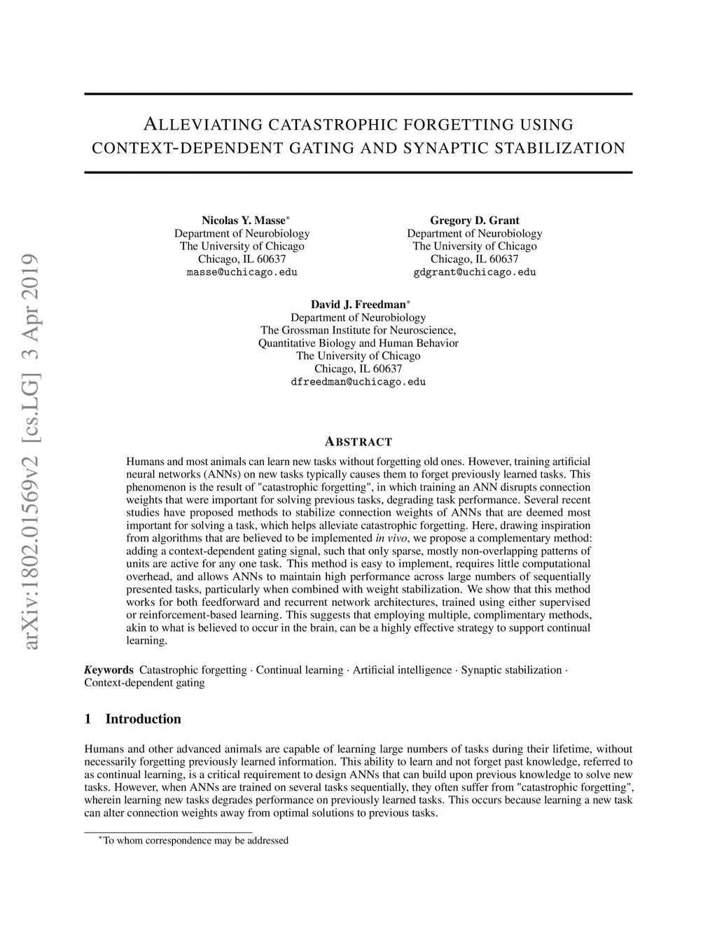 Humans and most animals can learn new tasks without forgetting old ones. However, training artificial neural networks (ANNs) on new tasks typically cause it to forget previously learned tasks. This phenomenon is the result of "catastrophic forgetting", in which training an ANN disrupts connection weights that were important for solving previous tasks, degrading task performance. Several recent studies have proposed methods to stabilize connection weights of ANNs that are deemed most important for solving a task, which helps alleviate catastrophic forgetting. Here, drawing inspiration from algorithms that are believed to be implemented in vivo, we propose a complementary method: adding a context-dependent gating signal, such that only sparse, mostly non-overlapping patterns of units are active for any one task. This method is easy to implement, requires little computational overhead, and allows ANNs to maintain high performance across large numbers of sequentially presented tasks when combined with weight stabilization. This work provides another example of how neuroscience-inspired algorithms can benefit ANN design and capability.