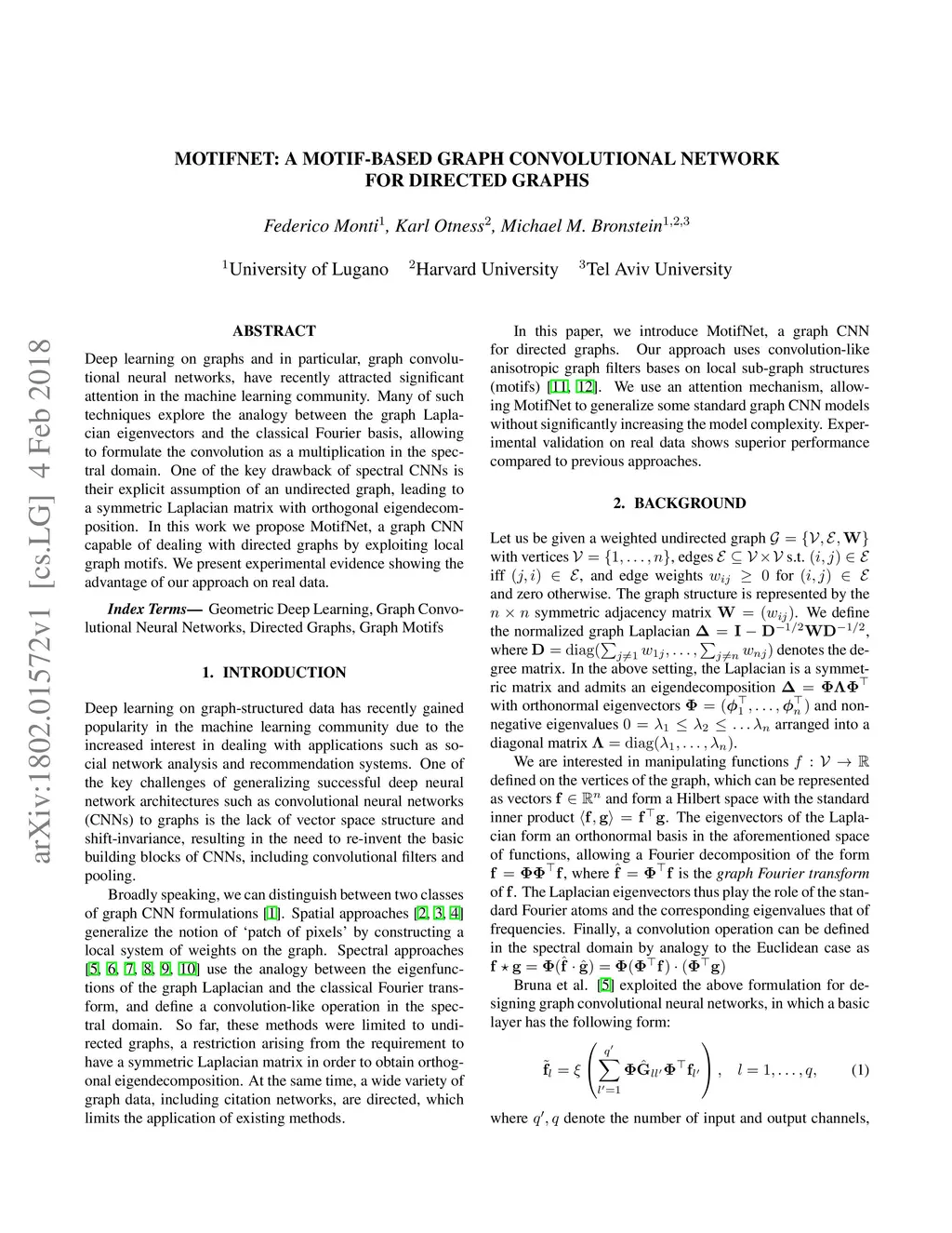 Deep learning on graphs and in particular, graph convolutional neural networks, have recently attracted significant attention in the machine learning community. Many of such techniques explore the analogy between the graph Laplacian eigenvectors and the classical Fourier basis, allowing to formulate the convolution as a multiplication in the spectral domain. One of the key drawback of spectral CNNs is their explicit assumption of an undirected graph, leading to a symmetric Laplacian matrix with orthogonal eigendecomposition. In this work we propose MotifNet, a graph CNN capable of dealing with directed graphs by exploiting local graph motifs. We present experimental evidence showing the advantage of our approach on real data.