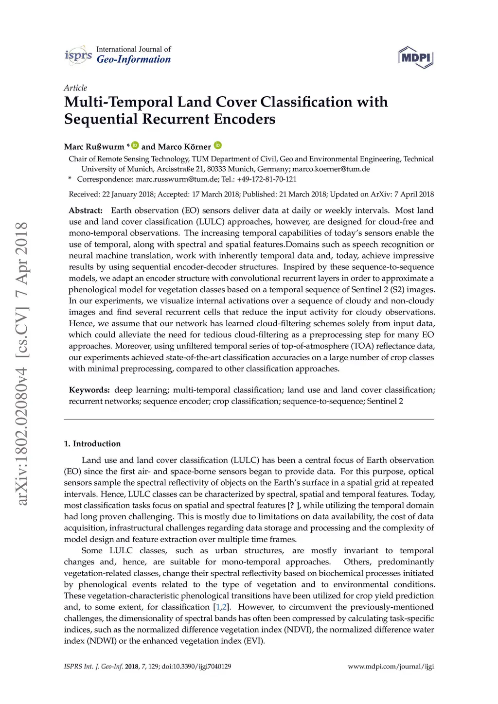 Multi-Temporal Land Cover Classification with Sequential Recurrent Encoders