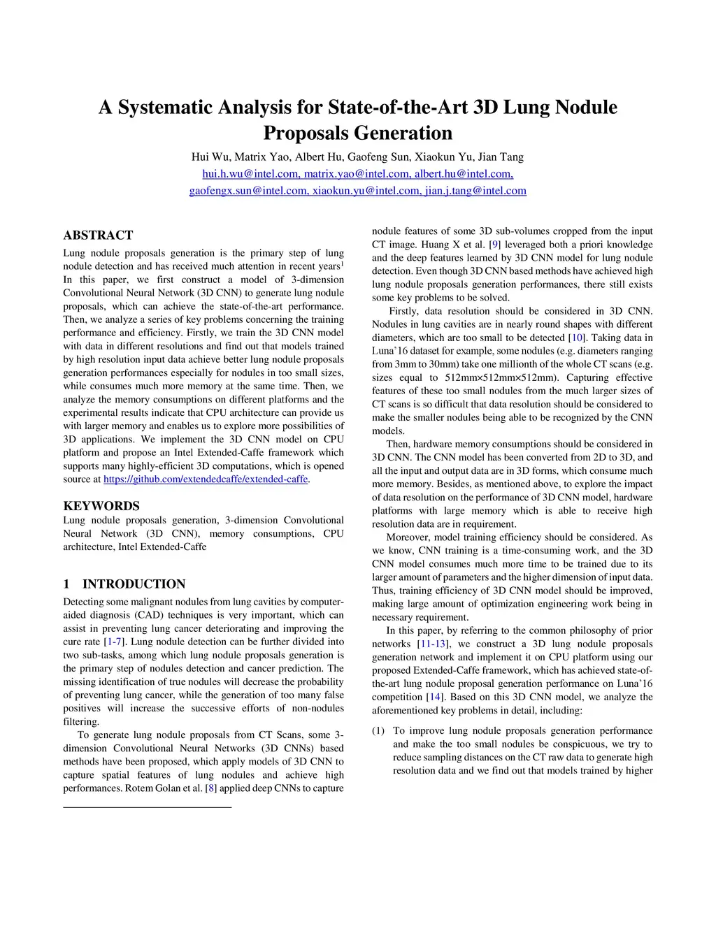 Lung nodule proposals generation is the primary step of lung nodule detection and has received much attention in recent years . In this paper, we first construct a model of 3-dimension Convolutional Neural Network (3D CNN) to generate lung nodule proposals, which can achieve the state-of-the-art performance. Then, we analyze a series of key problems concerning the training performance and efficiency. Firstly, we train the 3D CNN model with data in different resolutions and find out that models trained by high resolution input data achieve better lung nodule proposals generation performances especially for nodules in too small sizes, while consumes much more memory at the same time. Then, we analyze the memory consumptions on different platforms and the experimental results indicate that CPU architecture can provide us with larger memory and enables us to explore more possibilities of 3D applications. We implement the 3D CNN model on CPU platform and propose an Intel Extended-Caffe framework which supports many highly-efficient 3D computations, which is opened source at https://github.com/extendedcaffe/extended-caffe.