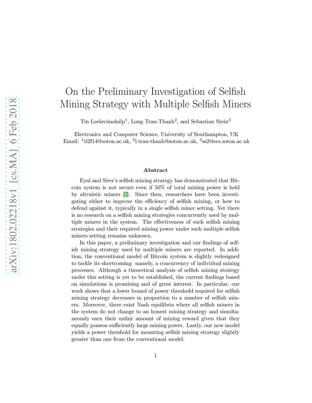 Eyal and Sirer's selfish mining strategy has demonstrated that Bitcoin system is not secure even if 50% of total mining power is held by altruistic miners. Since then, researchers have been investigating either to improve the efficiency of selfish mining, or how to defend against it, typically in a single selfish miner setting. Yet there is no research on a selfish mining strategies concurrently used by multiple miners in the system. The effectiveness of such selfish mining strategies and their required mining power under such multiple selfish miners setting remains unknown. In this paper, a preliminary investigation and our findings of selfish mining strategy used by multiple miners are reported. In addition, the conventional model of Bitcoin system is slightly redesigned to tackle its shortcoming: namely, a concurrency of individual mining processes. Although a theoretical analysis of selfish mining strategy under this setting is yet to be established, the current findings based on simulations is promising and of great interest. In particular, our work shows that a lower bound of power threshold required for selfish mining strategy decreases in proportion to a number of selfish miners. Moreover, there exist Nash equilibria where all selfish miners in the system do not change to an honest mining strategy and simultaneously earn their unfair amount of mining reward given that they equally possess sufficiently large mining power. Lastly, our new model yields a power threshold for mounting selfish mining strategy slightly greater than one from the conventional model.