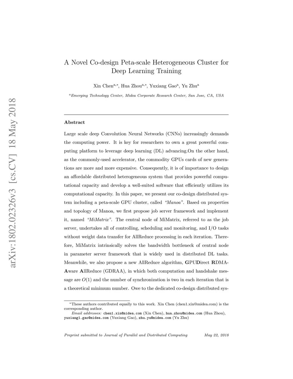 Large scale deep Convolution Neural Networks (CNNs) increasingly demands the computing power. It is key for researchers to own a great powerful computing platform to leverage deep learning (DL) advancing.On the other hand, as the commonly-used accelerator, the commodity GPUs cards of new generations are more and more expensive. Consequently, it is of importance to design an affordable distributed heterogeneous system that provides powerful computational capacity and develop a well-suited software that efficiently utilizes its computational capacity. In this paper, we present our co-design distributed system including a peta-scale GPU cluster, called "Manoa". Based on properties and topology of Manoa, we first propose job server framework and implement it, named "MiMatrix". The central node of MiMatrix, referred to as the job server, undertakes all of controlling, scheduling and monitoring, and I/O tasks without weight data transfer for AllReduce processing in each iteration. Therefore, MiMatrix intrinsically solves the bandwidth bottleneck of central node in parameter server framework that is widely used in distributed DL tasks. Meanwhile, we also propose a new AllReduce algorithm, GPUDirect RDMA-Aware AllReduce~(GDRAA), in which both computation and handshake message are O(1) and the number of synchronization is two in each iteration that is a theoretical minimum number. Owe to the dedicated co-design distributed system, MiMatrix efficiently makes use of the Manoa's computational capacity and bandwidth. We benchmark Manoa Resnet50 and Resenet101 on Imagenet-1K dataset. Some of results have demonstrated state-of-the-art.