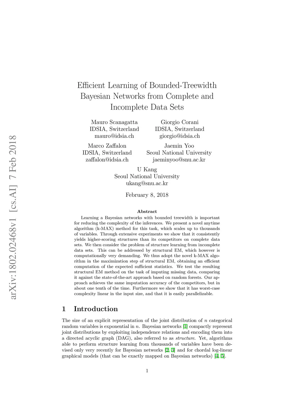 Learning a Bayesian networks with bounded treewidth is important for reducing the complexity of the inferences. We present a novel anytime algorithm (k-MAX) method for this task, which scales up to thousands of variables. Through extensive experiments we show that it consistently yields higher-scoring structures than its competitors on complete data sets. We then consider the problem of structure learning from incomplete data sets. This can be addressed by structural EM, which however is computationally very demanding. We thus adopt the novel k-MAX algorithm in the maximization step of structural EM, obtaining an efficient computation of the expected sufficient statistics. We test the resulting structural EM method on the task of imputing missing data, comparing it against the state-of-the-art approach based on random forests. Our approach achieves the same imputation accuracy of the competitors, but in about one tenth of the time. Furthermore we show that it has worst-case complexity linear in the input size, and that it is easily parallelizable.