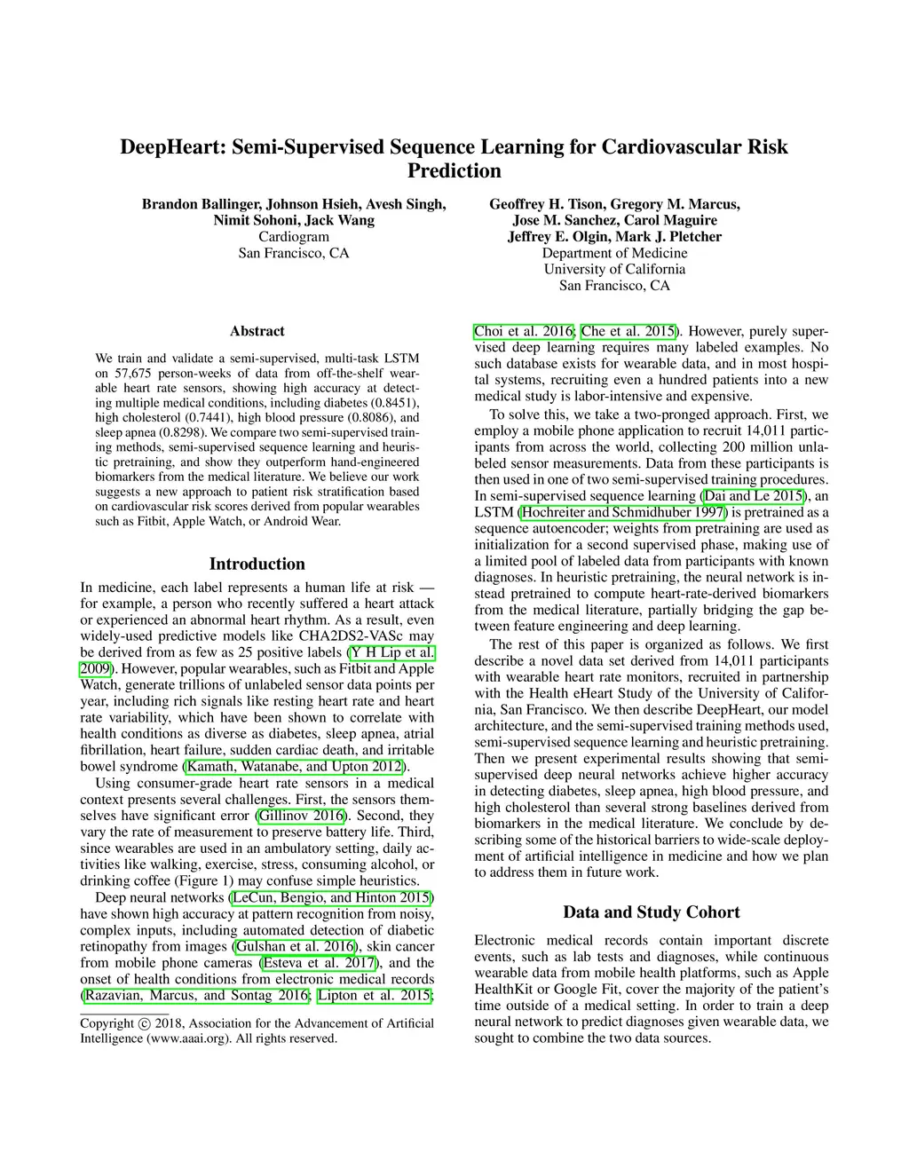 We train and validate a semi-supervised, multi-task LSTM on 57,675 person-weeks of data from off-the-shelf wearable heart rate sensors, showing high accuracy at detecting multiple medical conditions, including diabetes (0.8451), high cholesterol (0.7441), high blood pressure (0.8086), and sleep apnea (0.8298). We compare two semi-supervised train- ing methods, semi-supervised sequence learning and heuristic pretraining, and show they outperform hand-engineered biomarkers from the medical literature. We believe our work suggests a new approach to patient risk stratification based on cardiovascular risk scores derived from popular wearables such as Fitbit, Apple Watch, or Android Wear.