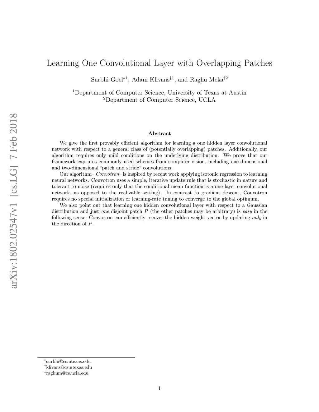 We give the first provably efficient algorithm for learning a one hidden layer convolutional network with respect to a general class of (potentially overlapping) patches. Additionally, our algorithm requires only mild conditions on the underlying distribution. We prove that our framework captures commonly used schemes from computer vision, including one-dimensional and two-dimensional "patch and stride" convolutions. Our algorithm-- -- is inspired by recent work applying isotonic regression to learning neural networks. Convotron uses a simple, iterative update rule that is stochastic in nature and tolerant to noise (requires only that the conditional mean function is a one layer convolutional network, as opposed to the realizable setting). In contrast to gradient descent, Convotron requires no special initialization or learning-rate tuning to converge to the global optimum. We also point out that learning one hidden convolutional layer with respect to a Gaussian distribution and just disjoint patch (the other patches may be arbitrary) is in the following sense: Convotron can efficiently recover the hidden weight vector by updating in the direction of .