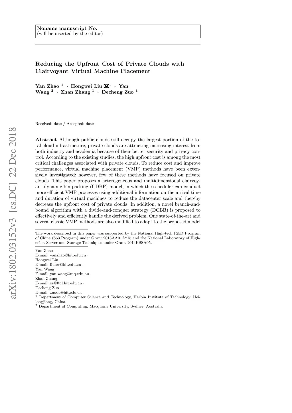 Although public clouds still occupy the largest portion of the total cloud infrastructure, private clouds are attracting increasing interest from both industry and academia because of their better security and privacy control. According to the existing studies, the high upfront cost is among the most critical challenges associated with private clouds. To reduce cost and improve performance, virtual machine placement (VMP) methods have been extensively investigated, however, few of these methods have focused on private clouds. This paper proposes a heterogeneous and multidimensional clairvoyant dynamic bin packing (CDBP) model, in which the scheduler can conduct more efficient VMP processes using additional information on the arrival time and duration of virtual machines to reduce the datacenter scale and thereby decrease the upfront cost of private clouds. In addition, a novel branch-and-bound algorithm with a divide-and-conquer strategy (DCBB) is proposed to effectively and efficiently handle the derived problem. One state-of-the-art and several classic VMP methods are also modified to adapt to the proposed model to observe their performance and compare with our proposed algorithm. Extensive experiments are conducted on both real-world and synthetic workloads to evaluate the accuracy and efficiency of the algorithms. The experimental results demonstrate that DCBB delivers near-optimal solutions with a convergence rate that is much faster than those of the other search-based algorithms evaluated. In particular, DCBB yields the optimal solution for a real-world workload with an execution time that is an order of magnitude shorter than that required by the original branch-and-bound (BB) algorithm.