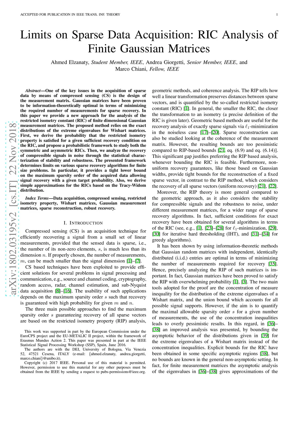 Limits on Sparse Data Acquisition: RIC Analysis of Finite Gaussian