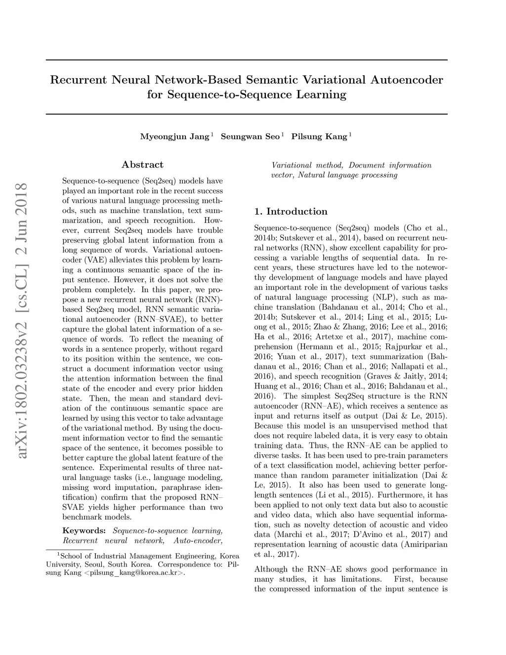 Sequence-to-sequence (Seq2seq) models have played an important role in the recent success of various natural language processing methods, such as machine translation, text summarization, and speech recognition. However, current Seq2seq models have trouble preserving global latent information from a long sequence of words. Variational autoencoder (VAE) alleviates this problem by learning a continuous semantic space of the input sentence. However, it does not solve the problem completely. In this paper, we propose a new recurrent neural network (RNN)-based Seq2seq model, RNN semantic variational autoencoder (RNN--SVAE), to better capture the global latent information of a sequence of words. To reflect the meaning of words in a sentence properly, without regard to its position within the sentence, we construct a document information vector using the attention information between the final state of the encoder and every prior hidden state. Then, the mean and standard deviation of the continuous semantic space are learned by using this vector to take advantage of the variational method. By using the document information vector to find the semantic space of the sentence, it becomes possible to better capture the global latent feature of the sentence. Experimental results of three natural language tasks (i.e., language modeling, missing word imputation, paraphrase identification) confirm that the proposed RNN--SVAE yields higher performance than two benchmark models.