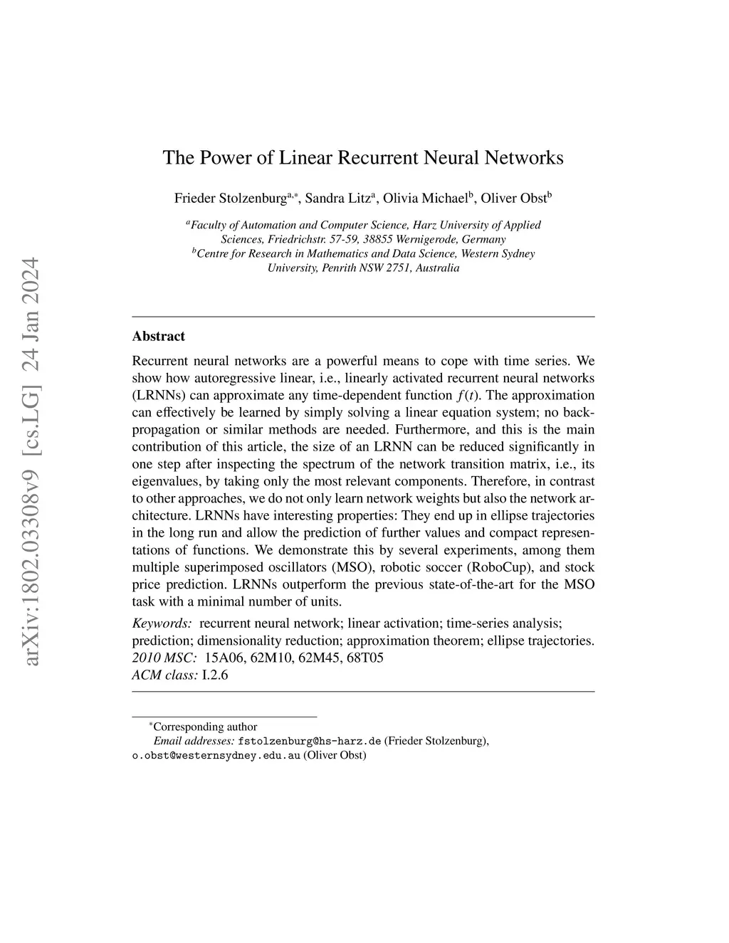 Recurrent neural networks are a powerful means to cope with time series. We show how autoregressive linear, i.e., linearly activated recurrent neural networks (LRNNs) can approximate any time-dependent function f(t). The approximation can effectively be learned by simply solving a linear equation system; no backpropagation or similar methods are needed. Furthermore, and this is the main contribution of this article, the size of an LRNN can be reduced significantly in one step after inspecting the spectrum of the network transition matrix, i.e., its eigenvalues, by taking only the most relevant components. Therefore, in contrast to other approaches, we do not only learn network weights but also the network architecture. LRNNs have interesting properties: They end up in ellipse trajectories in the long run and allow the prediction of further values and compact representations of functions. We demonstrate this by several experiments, among them multiple superimposed oscillators (MSO), robotic soccer (RoboCup), and stock price prediction. LRNNs outperform the previous state-of-the-art for the MSO task with a minimal number of units.