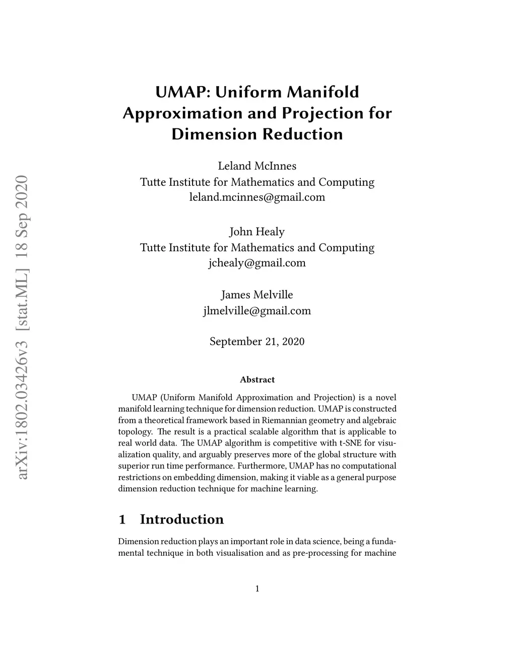 UMAP (Uniform Manifold Approximation and Projection) is a novel manifold learning technique for dimension reduction. UMAP is constructed from a theoretical framework based in Riemannian geometry and algebraic topology. The result is a practical scalable algorithm that applies to real world data. The UMAP algorithm is competitive with t-SNE for visualization quality, and arguably preserves more of the global structure with superior run time performance. Furthermore, UMAP has no computational restrictions on embedding dimension, making it viable as a general purpose dimension reduction technique for machine learning.