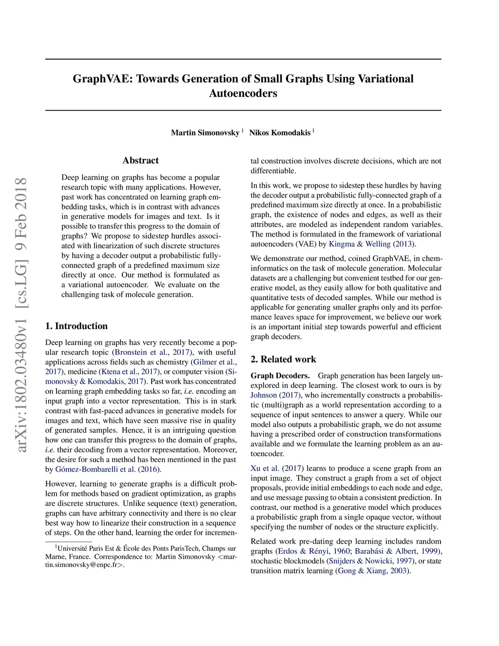 Deep learning on graphs has become a popular research topic with many applications. However, past work has concentrated on learning graph embedding tasks, which is in contrast with advances in generative models for images and text. Is it possible to transfer this progress to the domain of graphs? We propose to sidestep hurdles associated with linearization of such discrete structures by having a decoder output a probabilistic fully-connected graph of a predefined maximum size directly at once. Our method is formulated as a variational autoencoder. We evaluate on the challenging task of molecule generation.