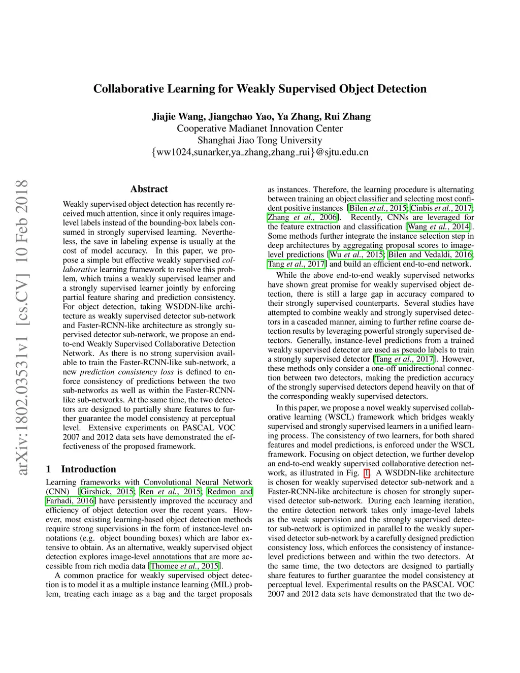 Weakly supervised object detection has recently received much attention, since it only requires image-level labels instead of the bounding-box labels consumed in strongly supervised learning. Nevertheless, the save in labeling expense is usually at the cost of model accuracy. In this paper, we propose a simple but effective weakly supervised collaborative learning framework to resolve this problem, which trains a weakly supervised learner and a strongly supervised learner jointly by enforcing partial feature sharing and prediction consistency. For object detection, taking WSDDN-like architecture as weakly supervised detector sub-network and Faster-RCNN-like architecture as strongly supervised detector sub-network, we propose an end-to-end Weakly Supervised Collaborative Detection Network. As there is no strong supervision available to train the Faster-RCNN-like sub-network, a new prediction consistency loss is defined to enforce consistency of predictions between the two sub-networks as well as within the Faster-RCNN-like sub-networks. At the same time, the two detectors are designed to partially share features to further guarantee the model consistency at perceptual level. Extensive experiments on PASCAL VOC 2007 and 2012 data sets have demonstrated the effectiveness of the proposed framework.