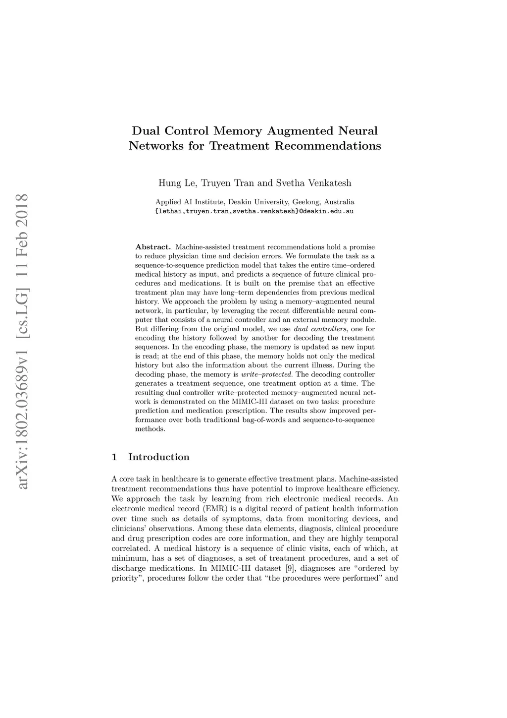 Machine-assisted treatment recommendations hold a promise to reduce physician time and decision errors. We formulate the task as a sequence-to-sequence prediction model that takes the entire time-ordered medical history as input, and predicts a sequence of future clinical procedures and medications. It is built on the premise that an effective treatment plan may have long-term dependencies from previous medical history. We approach the problem by using a memory-augmented neural network, in particular, by leveraging the recent differentiable neural computer that consists of a neural controller and an external memory module. But differing from the original model, we use dual controllers, one for encoding the history followed by another for decoding the treatment sequences. In the encoding phase, the memory is updated as new input is read; at the end of this phase, the memory holds not only the medical history but also the information about the current illness. During the decoding phase, the memory is write-protected. The decoding controller generates a treatment sequence, one treatment option at a time. The resulting dual controller write-protected memory-augmented neural network is demonstrated on the MIMIC-III dataset on two tasks: procedure prediction and medication prescription. The results show improved performance over both traditional bag-of-words and sequence-to-sequence methods.