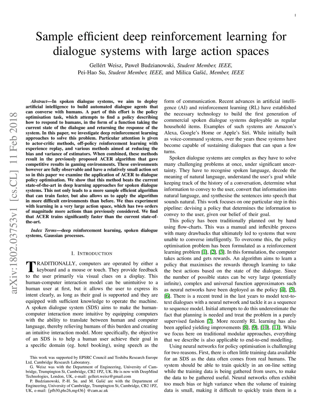 In spoken dialogue systems, we aim to deploy artificial intelligence to build automated dialogue agents that can converse with humans. A part of this effort is the policy optimisation task, which attempts to find a policy describing how to respond to humans, in the form of a function taking the current state of the dialogue and returning the response of the system. In this paper, we investigate deep reinforcement learning approaches to solve this problem. Particular attention is given to actor-critic methods, off-policy reinforcement learning with experience replay, and various methods aimed at reducing the bias and variance of estimators. When combined, these methods result in the previously proposed ACER algorithm that gave competitive results in gaming environments. These environments however are fully observable and have a relatively small action set so in this paper we examine the application of ACER to dialogue policy optimisation. We show that this method beats the current state-of-the-art in deep learning approaches for spoken dialogue systems. This not only leads to a more sample efficient algorithm that can train faster, but also allows us to apply the algorithm in more difficult environments than before. We thus experiment with learning in a very large action space, which has two orders of magnitude more actions than previously considered. We find that ACER trains significantly faster than the current state-of-the-art.