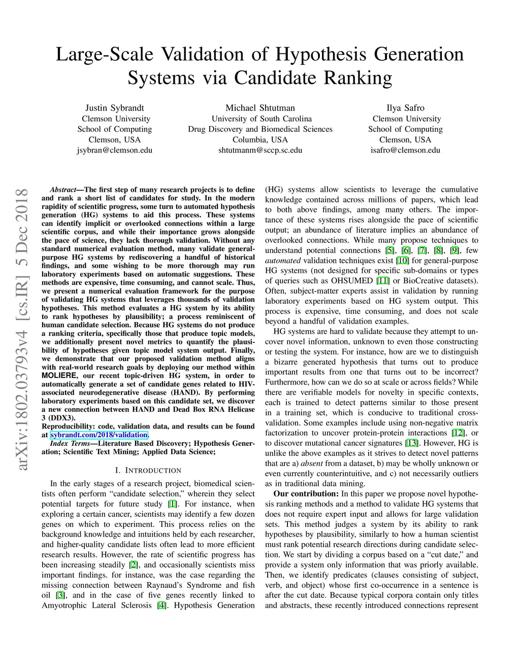 The first step of many research projects is to define and rank a short list of candidates for study. In the modern rapidity of scientific progress, some turn to automated hypothesis generation (HG) systems to aid this process. These systems can identify implicit or overlooked connections within a large scientific corpus, and while their importance grows alongside the pace of science, they lack thorough validation. Without any standard numerical evaluation method, many validate general-purpose HG systems by rediscovering a handful of historical findings, and some wishing to be more thorough may run laboratory experiments based on automatic suggestions. These methods are expensive, time consuming, and cannot scale. Thus, we present a numerical evaluation framework for the purpose of validating HG systems that leverages thousands of validation hypotheses. This method evaluates a HG system by its ability to rank hypotheses by plausibility; a process reminiscent of human candidate selection. Because HG systems do not produce a ranking criteria, specifically those that produce topic models, we additionally present novel metrics to quantify the plausibility of hypotheses given topic model system output. Finally, we demonstrate that our proposed validation method aligns with real-world research goals by deploying our method within Moliere, our recent topic-driven HG system, in order to automatically generate a set of candidate genes related to HIV-associated neurodegenerative disease (HAND). By performing laboratory experiments based on this candidate set, we discover a new connection between HAND and Dead Box RNA Helicase 3 (DDX3). Reproducibility: code, validation data, and results can be found at sybrandt.com/2018/validation.