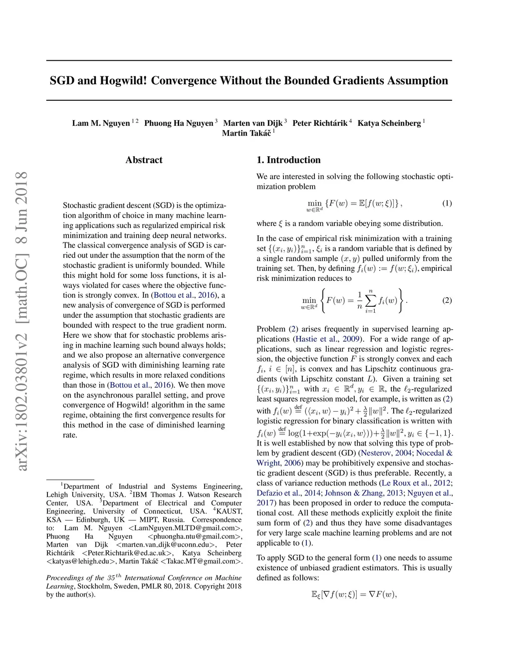 Stochastic gradient descent (SGD) is the optimization algorithm of choice in many machine learning applications such as regularized empirical risk minimization and training deep neural networks. The classical convergence analysis of SGD is carried out under the assumption that the norm of the stochastic gradient is uniformly bounded. While this might hold for some loss functions, it is always violated for cases where the objective function is strongly convex. In (Bottou et al.,2016), a new analysis of convergence of SGD is performed under the assumption that stochastic gradients are bounded with respect to the true gradient norm. Here we show that for stochastic problems arising in machine learning such bound always holds; and we also propose an alternative convergence analysis of SGD with diminishing learning rate regime, which results in more relaxed conditions than those in (Bottou et al.,2016). We then move on the asynchronous parallel setting, and prove convergence of Hogwild! algorithm in the same regime, obtaining the first convergence results for this method in the case of diminished learning rate.