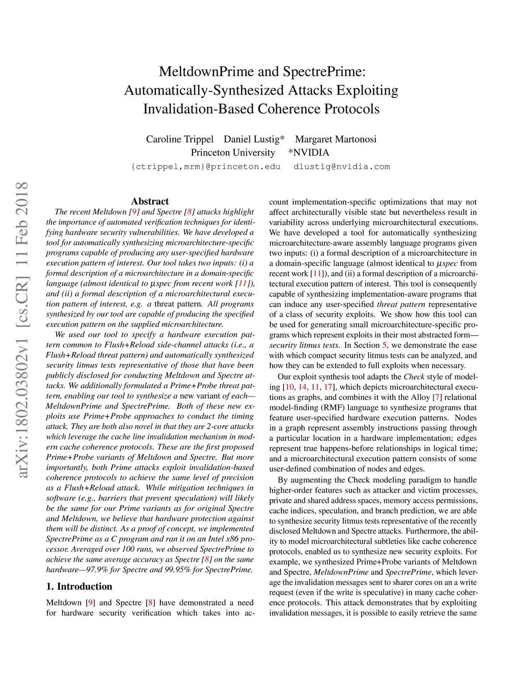 The recent Meltdown and Spectre attacks highlight the importance of automated verification techniques for identifying hardware security vulnerabilities. We have developed a tool for synthesizing microarchitecture-specific programs capable of producing any user-specified hardware execution pattern of interest. Our tool takes two inputs: a formal description of (i) a microarchitecture in a domain-specific language, and (ii) a microarchitectural execution pattern of interest, e.g. a threat pattern. All programs synthesized by our tool are capable of producing the specified execution pattern on the supplied microarchitecture. We used our tool to specify a hardware execution pattern common to Flush+Reload attacks and automatically synthesized security litmus tests representative of those that have been publicly disclosed for conducting Meltdown and Spectre attacks. We also formulated a Prime+Probe threat pattern, enabling our tool to synthesize a new variant of each---MeltdownPrime and SpectrePrime. Both of these new exploits use Prime+Probe approaches to conduct the timing attack. They are both also novel in that they are 2-core attacks which leverage the cache line invalidation mechanism in modern cache coherence protocols. These are the first proposed Prime+Probe variants of Meltdown and Spectre. But more importantly, both Prime attacks exploit invalidation-based coherence protocols to achieve the same level of precision as a Flush+Reload attack. While mitigation techniques in software (e.g., barriers that prevent speculation) will likely be the same for our Prime variants as for original Spectre and Meltdown, we believe that hardware protection against them will be distinct. As a proof of concept, we implemented SpectrePrime as a C program and ran it on an Intel x86 processor, averaging about the same accuracy as Spectre over 100 runs---97.9% for Spectre and 99.95% for SpectrePrime.