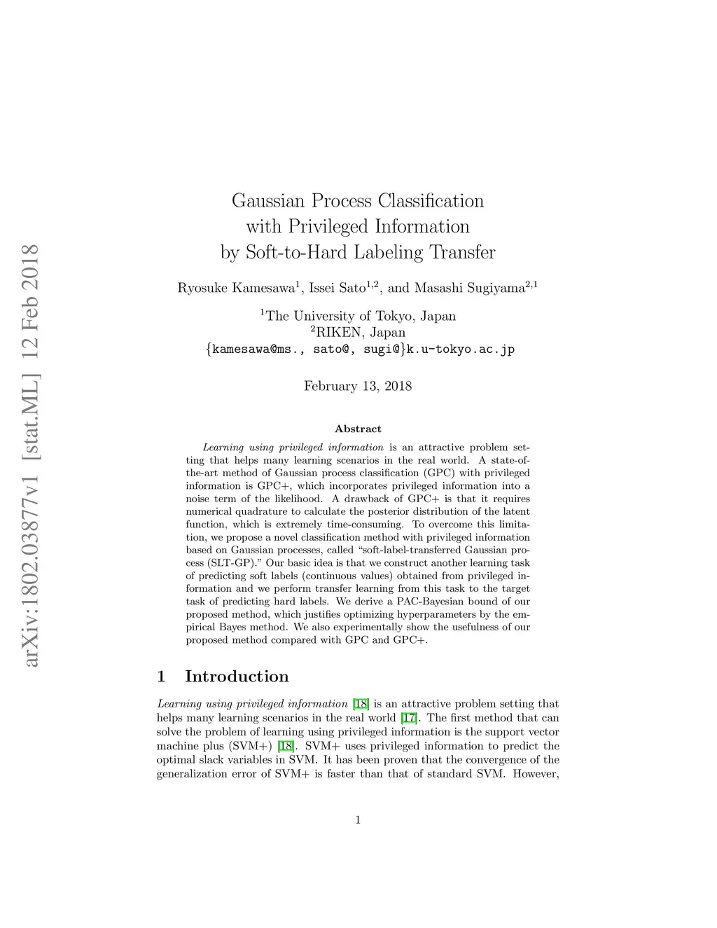 Learning using privileged information is an attractive problem setting that helps many learning scenarios in the real world. A state-of-the-art method of Gaussian process classification (GPC) with privileged information is GPC+, which incorporates privileged information into a noise term of the likelihood. A drawback of GPC+ is that it requires numerical quadrature to calculate the posterior distribution of the latent function, which is extremely time-consuming. To overcome this limitation, we propose a novel classification method with privileged information based on Gaussian processes, called "soft-label-transferred Gaussian process (SLT-GP)." Our basic idea is that we construct another learning task of predicting soft labels (continuous values) obtained from privileged information and we perform transfer learning from this task to the target task of predicting hard labels. We derive a PAC-Bayesian bound of our proposed method, which justifies optimizing hyperparameters by the empirical Bayes method. We also experimentally show the usefulness of our proposed method compared with GPC and GPC+.