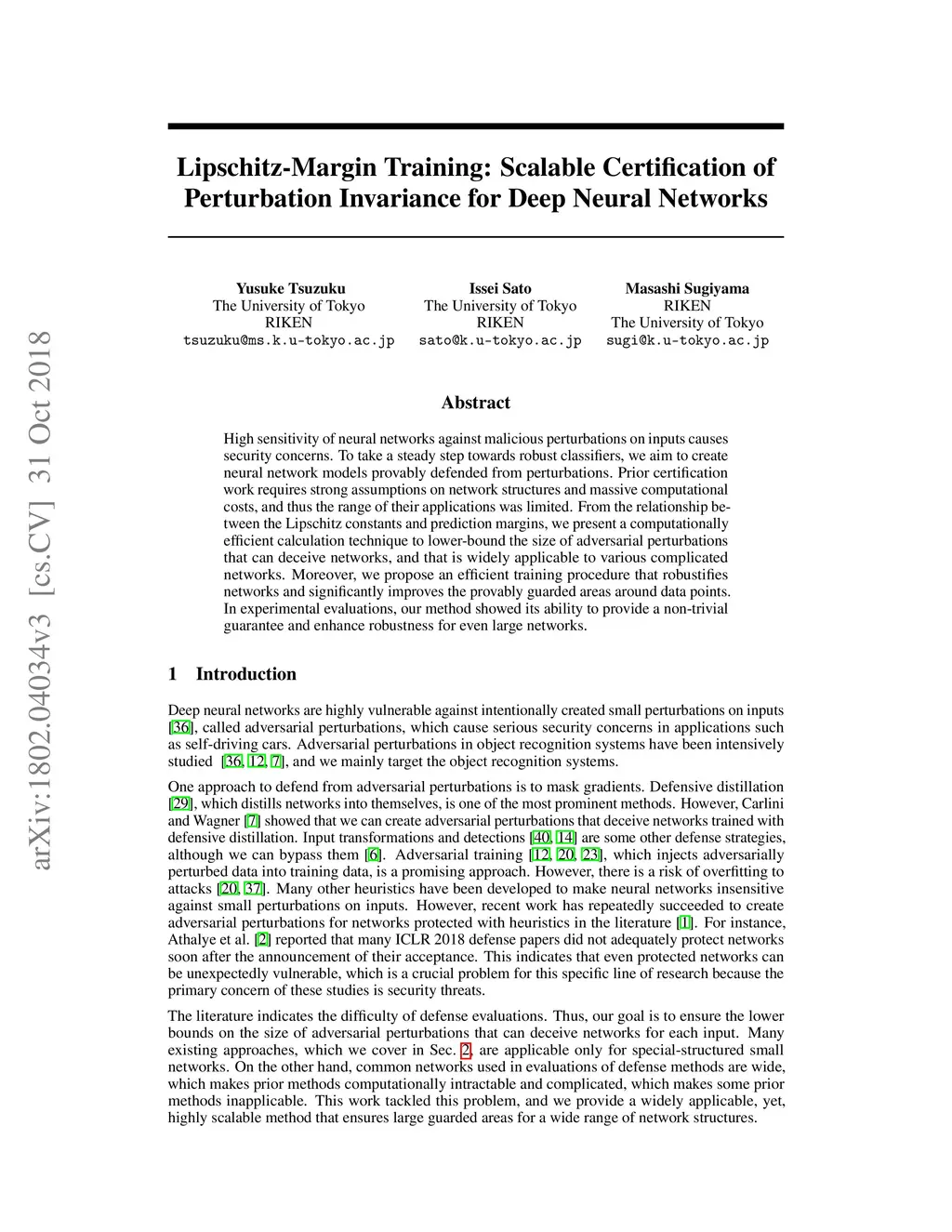 High sensitivity of neural networks against malicious perturbations on inputs causes security concerns. To take a steady step towards robust classifiers, we aim to create neural network models provably defended from perturbations. Prior certification work requires strong assumptions on network structures and massive computational costs, and thus the range of their applications was limited. From the relationship between the Lipschitz constants and prediction margins, we present a computationally efficient calculation technique to lower-bound the size of adversarial perturbations that can deceive networks, and that is widely applicable to various complicated networks. Moreover, we propose an efficient training procedure that robustifies networks and significantly improves the provably guarded areas around data points. In experimental evaluations, our method showed its ability to provide a non-trivial guarantee and enhance robustness for even large networks.