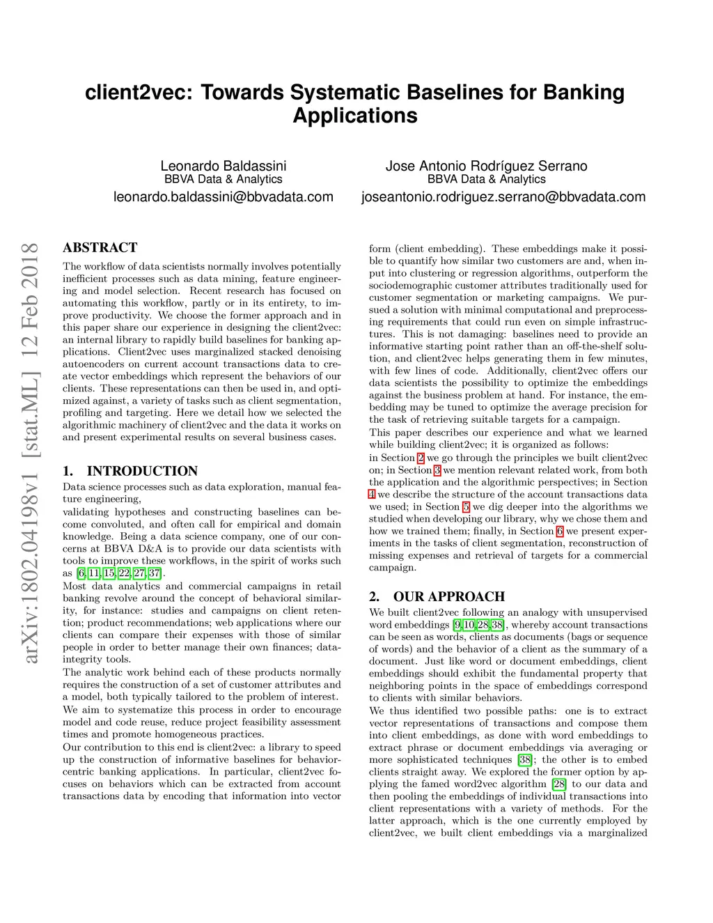 The workflow of data scientists normally involves potentially inefficient processes such as data mining, feature engineering and model selection. Recent research has focused on automating this workflow, partly or in its entirety, to improve productivity. We choose the former approach and in this paper share our experience in designing the client2vec: an internal library to rapidly build baselines for banking applications. Client2vec uses marginalized stacked denoising autoencoders on current account transactions data to create vector embeddings which represent the behaviors of our clients. These representations can then be used in, and optimized against, a variety of tasks such as client segmentation, profiling and targeting. Here we detail how we selected the algorithmic machinery of client2vec and the data it works on and present experimental results on several business cases.