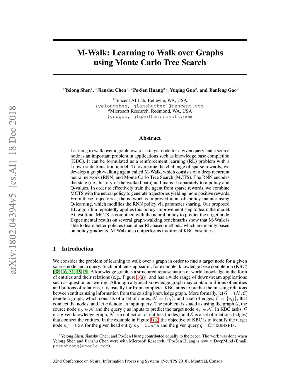 M-Walk: Learning to Walk over Graphs using Monte Carlo Tree Search