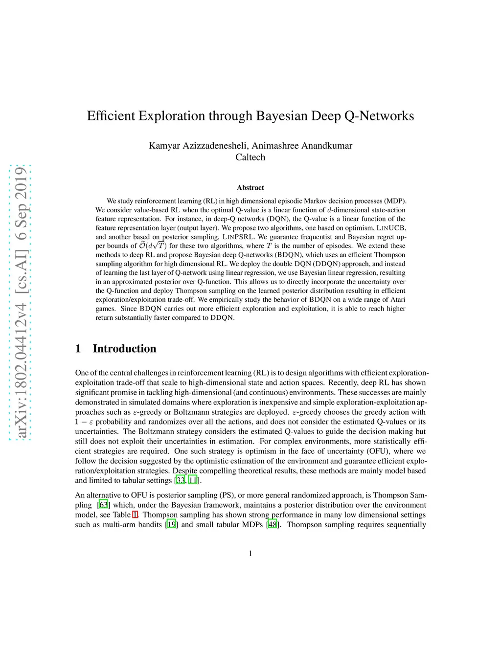 We study reinforcement learning (RL) in high dimensional episodic Markov decision processes (MDP). We consider value-based RL when the optimal Q-value is a linear function of d-dimensional state-action feature representation. For instance, in deep-Q networks (DQN), the Q-value is a linear function of the feature representation layer (output layer). We propose two algorithms, one based on optimism, LINUCB, and another based on posterior sampling, LINPSRL. We guarantee frequentist and Bayesian regret upper bounds of O(d sqrt{T}) for these two algorithms, where T is the number of episodes. We extend these methods to deep RL and propose Bayesian deep Q-networks (BDQN), which uses an efficient Thompson sampling algorithm for high dimensional RL. We deploy the double DQN (DDQN) approach, and instead of learning the last layer of Q-network using linear regression, we use Bayesian linear regression, resulting in an approximated posterior over Q-function. This allows us to directly incorporate the uncertainty over the Q-function and deploy Thompson sampling on the learned posterior distribution resulting in efficient exploration/exploitation trade-off. We empirically study the behavior of BDQN on a wide range of Atari games. Since BDQN carries out more efficient exploration and exploitation, it is able to reach higher return substantially faster compared to DDQN.