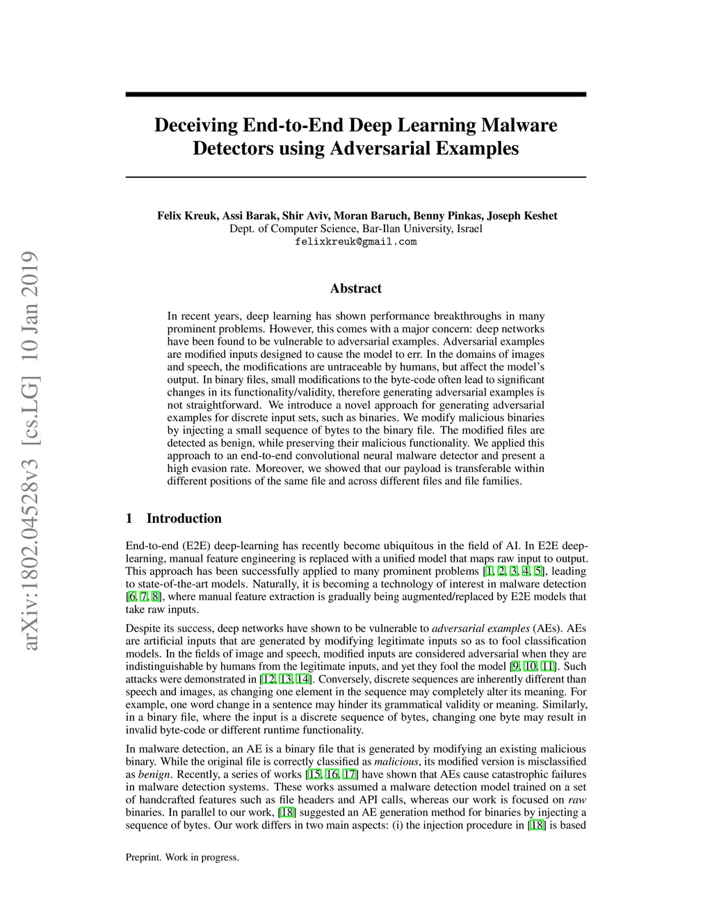 In recent years, deep learning has shown performance breakthroughs in many applications, such as image detection, image segmentation, pose estimation, and speech recognition. However, this comes with a major concern: deep networks have been found to be vulnerable to adversarial examples. Adversarial examples are slightly modified inputs that are intentionally designed to cause a misclassification by the model. In the domains of images and speech, the modifications are so small that they are not seen or heard by humans, but nevertheless greatly affect the classification of the model. Deep learning models have been successfully applied to malware detection. In this domain, generating adversarial examples is not straightforward, as small modifications to the bytes of the file could lead to significant changes in its functionality and validity. We introduce a novel loss function for generating adversarial examples specifically tailored for discrete input sets, such as executable bytes. We modify malicious binaries so that they would be detected as benign, while preserving their original functionality, by injecting a small sequence of bytes (payload) in the binary file. We applied this approach to an end-to-end convolutional deep learning malware detection model and show a high rate of detection evasion. Moreover, we show that our generated payload is robust enough to be transferable within different locations of the same file and across different files, and that its entropy is low and similar to that of benign data sections.
