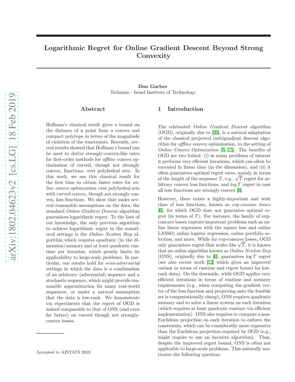 Hoffman's classical result gives a bound on the distance of a point from a convex and compact polytope in terms of the magnitude of violation of the constraints. Recently, several results showed that Hoffman's bound can be used to derive strongly-convex-like rates for first-order methods for convex optimization of curved, though not strongly convex, functions, over polyhedral sets. In this work, we use this classical result for the first time to obtain faster rates for \textit{online convex optimization} over polyhedral sets with curved convex, though not strongly convex, loss functions. Mainly, we show that under several reasonable assumptions on the data, the standard \textit{Online Gradient Descent} (OGD) algorithm guarantees logarithmic regret. To the best of our knowledge, the only previous algorithm to achieve logarithmic regret in the considered settings is the \textit{Online Newton Step} algorithm which requires quadratic (in the dimension) memory and to solve a linear system on each iteration, which greatly limits its applicability to large-scale problems. We also show that in the corresponding stochastic convex optimization setting, Stochastic Gradient Descent achieves convergence rate of , matching the strongly-convex case.