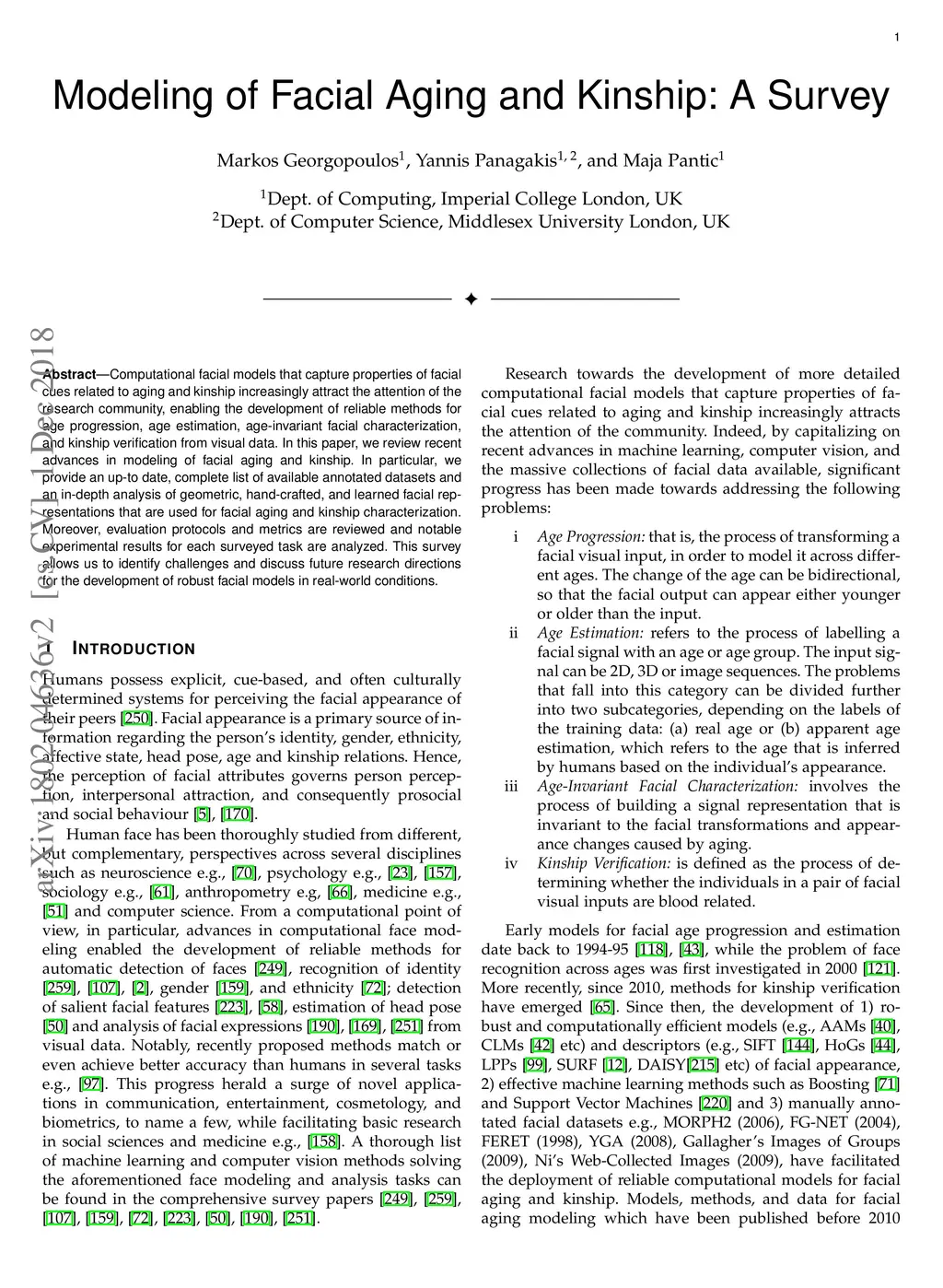 Computational facial models that capture properties of facial cues related to aging and kinship increasingly attract the attention of the research community, enabling the development of reliable methods for age progression, age estimation, age-invariant facial characterization, and kinship verification from visual data. In this paper, we review recent advances in modeling of facial aging and kinship. In particular, we provide an up-to date, complete list of available annotated datasets and an in-depth analysis of geometric, hand-crafted, and learned facial representations that are used for facial aging and kinship characterization. Moreover, evaluation protocols and metrics are reviewed and notable experimental results for each surveyed task are analyzed. This survey allows us to identify challenges and discuss future research directions for the development of robust facial models in real-world conditions.