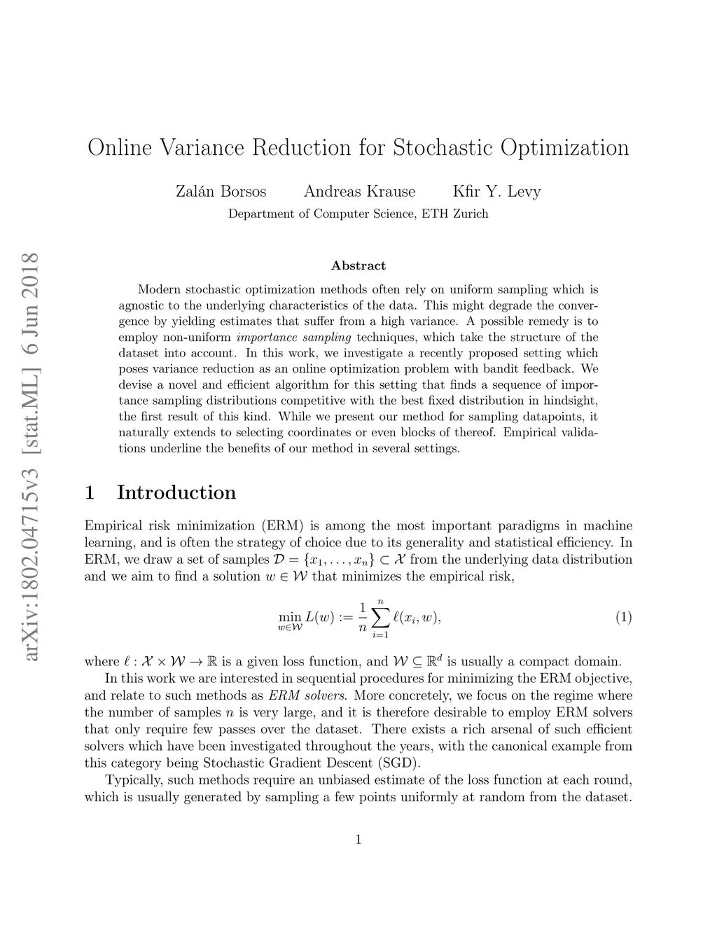 Modern stochastic optimization methods often rely on uniform sampling which is agnostic to the underlying characteristics of the data. This might degrade the convergence by yielding estimates that suffer from a high variance. A possible remedy is to employ non-uniform importance sampling techniques, which take the structure of the dataset into account. In this work, we investigate a recently proposed setting which poses variance reduction as an online optimization problem with bandit feedback. We devise a novel and efficient algorithm for this setting that finds a sequence of importance sampling distributions competitive with the best fixed distribution in hindsight, the first result of this kind. While we present our method for sampling datapoints, it naturally extends to selecting coordinates or even blocks of thereof. Empirical validations underline the benefits of our method in several settings.