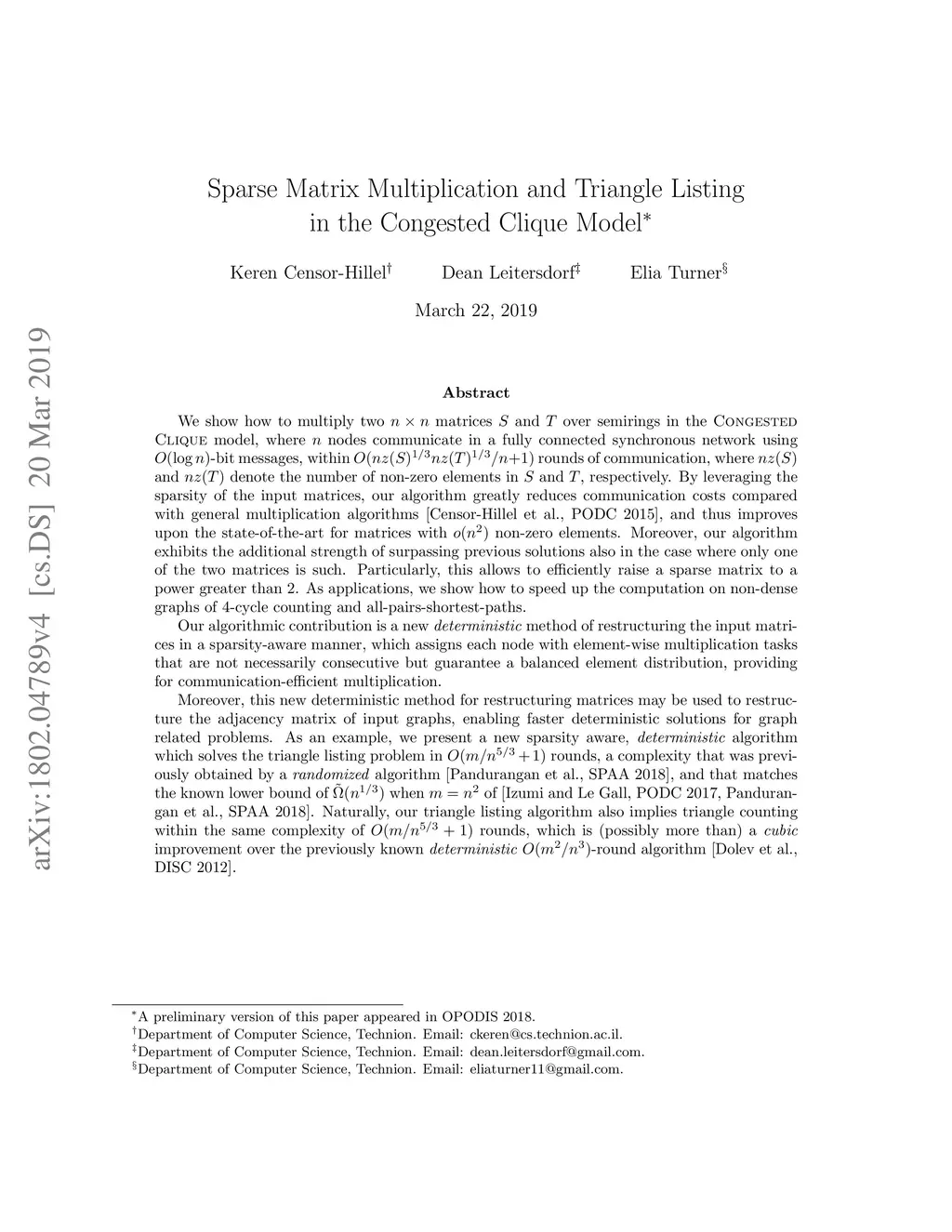 We multiply two matrices over semirings in the Congested Clique model, where fully connected nodes communicate synchronously using -bit messages, within rounds of communication, where denotes the number of non-zero elements in a matrix . By leveraging the sparsity of the input matrices, our algorithm greatly reduces communication compared with general algorithms [Censor-Hillel et al., PODC 2015], improving upon the state-of-the-art for matrices with non-zero elements. Our algorithm exhibits the additional strength of surpassing previous solutions also when only one matrix is sparse. This allows efficiently raising a sparse matrix to a power greater than 2. As applications, we speed up 4-cycle counting and APSP in sparse graphs. Our algorithmic contribution is a new \emph{deterministic} method of restructuring the input matrices in a sparsity-aware manner, which assigns each node with element-wise multiplication tasks that are not necessarily consecutive but are balanced, yielding communication-efficient multiplication. Moreover, this new deterministic method for restructuring matrices may be used to restructure the adjacency matrix of input graphs, enabling faster solutions for graph related problems. As an example, we present a new deterministic algorithm which solves the triangle listing problem in rounds, a complexity that was previously obtained by a \emph{randomized} algorithm [Pandurangan et al., SPAA 2018] and matches the lower bound of when of [Izumi and Le Gall, PODC 2017, Pandurangan et al., SPAA 2018]. Our triangle listing algorithm implies triangle counting with the same complexity of rounds, which is a \emph{cubic} improvement over the previous -round algorithm [Dolev et al., DISC 2012].