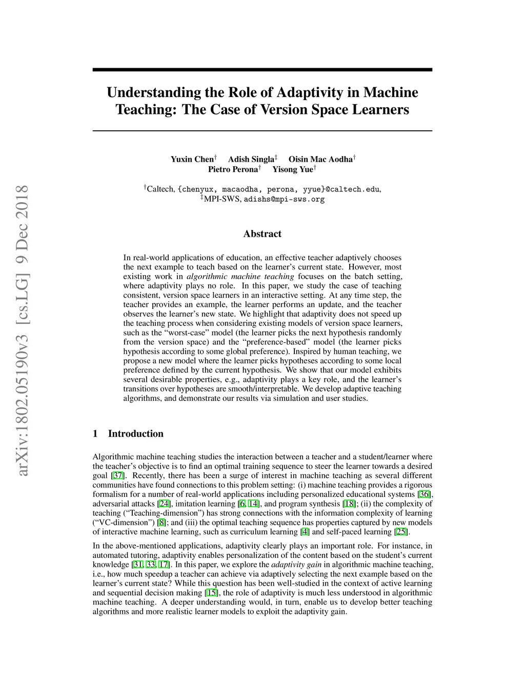 In real-world applications of education, an effective teacher adaptively chooses the next example to teach based on the learner's current state. However, most existing work in algorithmic machine teaching focuses on the batch setting, where adaptivity plays no role. In this paper, we study the case of teaching consistent, version space learners in an interactive setting. At any time step, the teacher provides an example, the learner performs an update, and the teacher observes the learner's new state. We highlight that adaptivity does not speed up the teaching process when considering existing models of version space learners, such as "worst-case" (the learner picks the next hypothesis randomly from the version space) and "preference-based" (the learner picks hypothesis according to some global preference). Inspired by human teaching, we propose a new model where the learner picks hypotheses according to some local preference defined by the current hypothesis. We show that our model exhibits several desirable properties, e.g., adaptivity plays a key role, and the learner's transitions over hypotheses are smooth/interpretable. We develop efficient teaching algorithms and demonstrate our results via simulation and user studies.