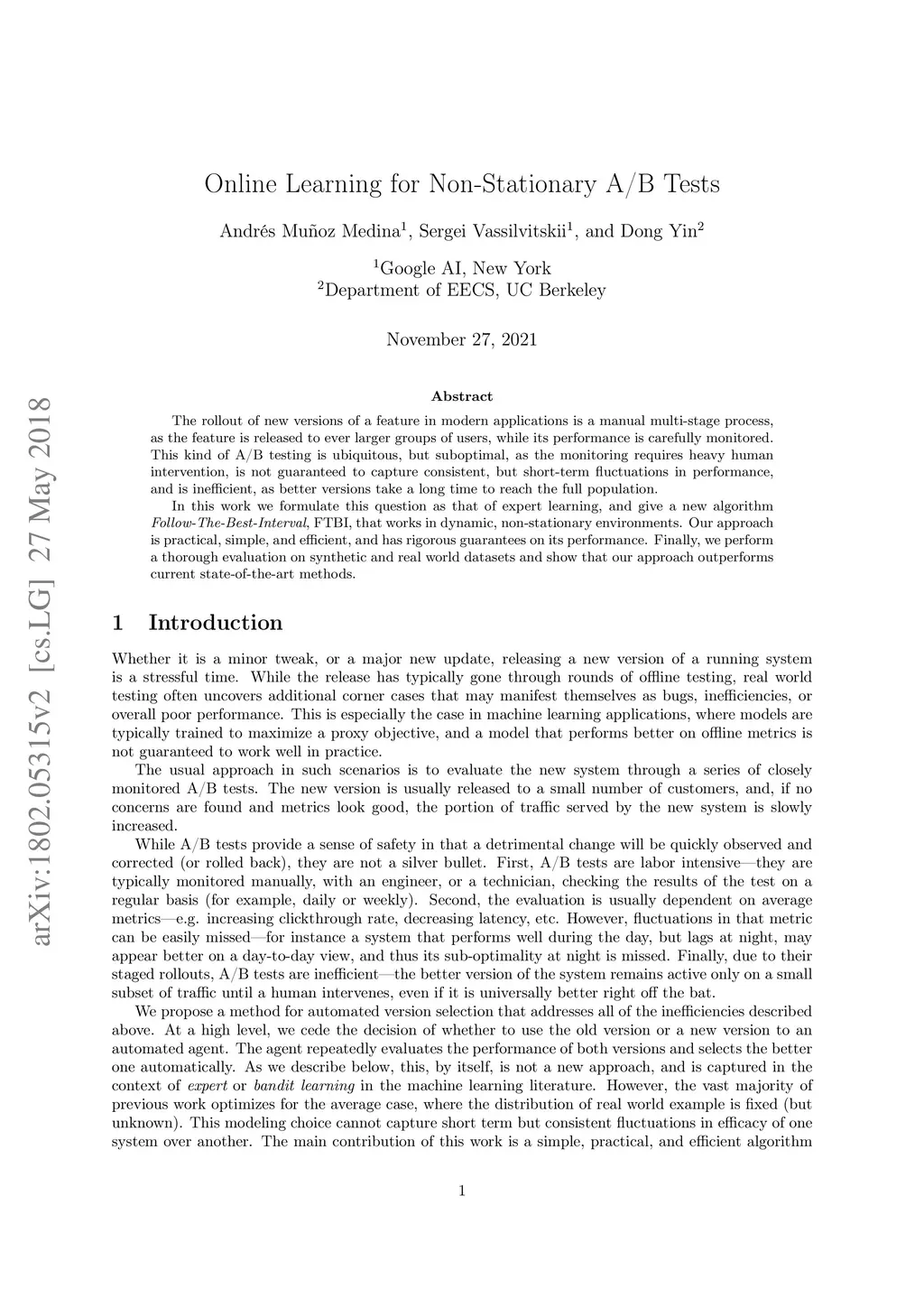 The rollout of new versions of a feature in modern applications is a manual multi-stage process, as the feature is released to ever larger groups of users, while its performance is carefully monitored. This kind of A/B testing is ubiquitous, but suboptimal, as the monitoring requires heavy human intervention, is not guaranteed to capture consistent, but short-term fluctuations in performance, and is inefficient, as better versions take a long time to reach the full population. In this work we formulate this question as that of expert learning, and give a new algorithm Follow-The-Best-Interval, FTBI, that works in dynamic, non-stationary environments. Our approach is practical, simple, and efficient, and has rigorous guarantees on its performance. Finally, we perform a thorough evaluation on synthetic and real world datasets and show that our approach outperforms current state-of-the-art methods.
