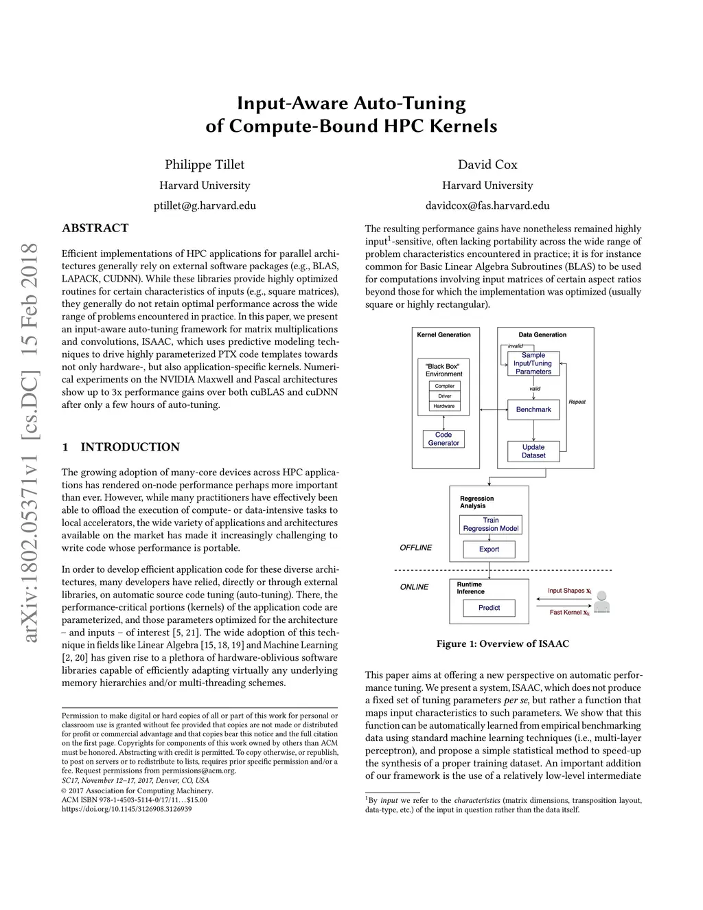 Efficient implementations of HPC applications for parallel architectures generally rely on external software packages (e.g., BLAS, LAPACK, CUDNN). While these libraries provide highly optimized routines for certain characteristics of inputs (e.g., square matrices), they generally do not retain optimal performance across the wide range of problems encountered in practice. In this paper, we present an input-aware auto-tuning framework for matrix multiplications and convolutions, ISAAC, which uses predictive modeling techniques to drive highly parameterized PTX code templates towards not only hardware-, but also application-specific kernels. Numerical experiments on the NVIDIA Maxwell and Pascal architectures show up to 3x performance gains over both cuBLAS and cuDNN after only a few hours of auto-tuning.