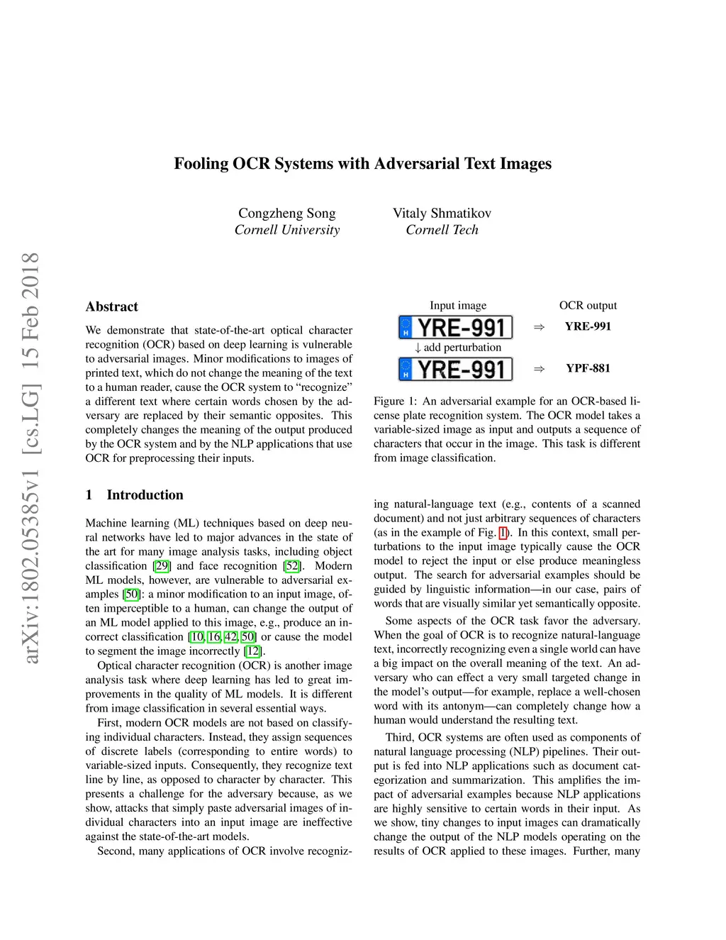 We demonstrate that state-of-the-art optical character recognition (OCR) based on deep learning is vulnerable to adversarial images. Minor modifications to images of printed text, which do not change the meaning of the text to a human reader, cause the OCR system to "recognize" a different text where certain words chosen by the adversary are replaced by their semantic opposites. This completely changes the meaning of the output produced by the OCR system and by the NLP applications that use OCR for preprocessing their inputs.