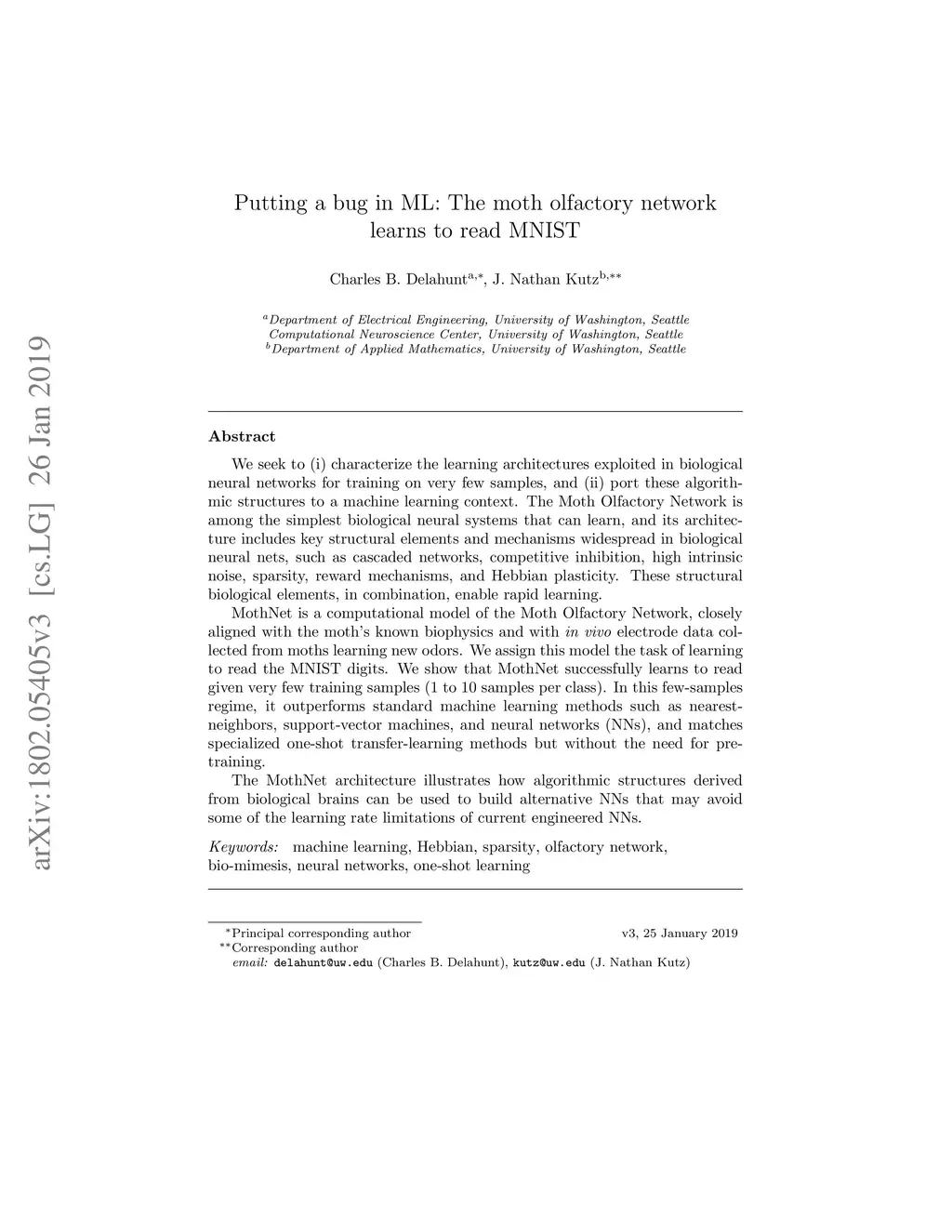 We seek to (i) characterize the learning architectures exploited in biological neural networks for training on very few samples, and (ii) port these algorithmic structures to a machine learning context. The Moth Olfactory Network is among the simplest biological neural systems that can learn, and its architecture includes key structural elements and mechanisms widespread in biological neural nets, such as cascaded networks, competitive inhibition, high intrinsic noise, sparsity, reward mechanisms, and Hebbian plasticity. These structural biological elements, in combination, enable rapid learning. MothNet is a computational model of the Moth Olfactory Network, closely aligned with the moth's known biophysics and with in vivo electrode data collected from moths learning new odors. We assign this model the task of learning to read the MNIST digits. We show that MothNet successfully learns to read given very few training samples (1 to 10 samples per class). In this few-samples regime, it outperforms standard machine learning methods such as nearest-neighbors, support-vector machines, and neural networks (NNs), and matches specialized one-shot transfer-learning methods but without the need for pre-training. The MothNet architecture illustrates how algorithmic structures derived from biological brains can be used to build alternative NNs that may avoid some of the learning rate limitations of current engineered NNs.
