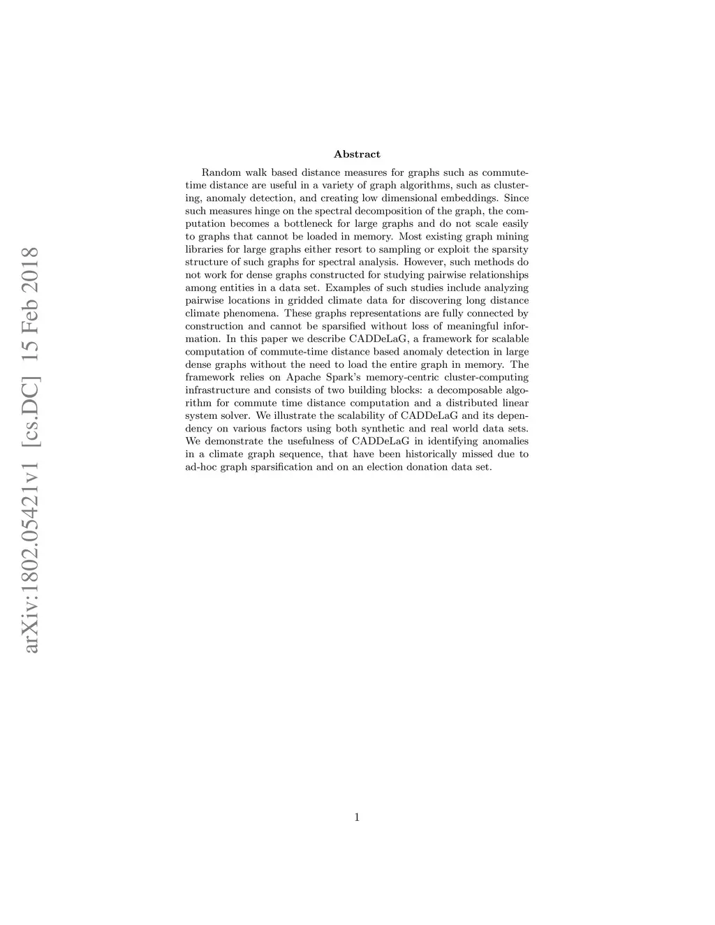 Random walk based distance measures for graphs such as commute-time distance are useful in a variety of graph algorithms, such as clustering, anomaly detection, and creating low dimensional embeddings. Since such measures hinge on the spectral decomposition of the graph, the computation becomes a bottleneck for large graphs and do not scale easily to graphs that cannot be loaded in memory. Most existing graph mining libraries for large graphs either resort to sampling or exploit the sparsity structure of such graphs for spectral analysis. However, such methods do not work for dense graphs constructed for studying pairwise relationships among entities in a data set. Examples of such studies include analyzing pairwise locations in gridded climate data for discovering long distance climate phenomena. These graphs representations are fully connected by construction and cannot be sparsified without loss of meaningful information. In this paper we describe CADDeLaG, a framework for scalable computation of commute-time distance based anomaly detection in large dense graphs without the need to load the entire graph in memory. The framework relies on Apache Spark's memory-centric cluster-computing infrastructure and consists of two building blocks: a decomposable algorithm for commute time distance computation and a distributed linear system solver. We illustrate the scalability of CADDeLaG and its dependency on various factors using both synthetic and real world data sets. We demonstrate the usefulness of CADDeLaG in identifying anomalies in a climate graph sequence, that have been historically missed due to ad hoc graph sparsification and on an election donation data set.