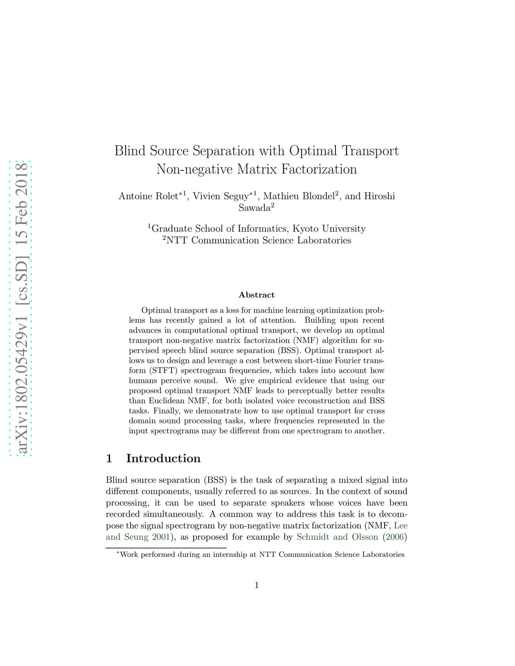 Optimal transport as a loss for machine learning optimization problems has recently gained a lot of attention. Building upon recent advances in computational optimal transport, we develop an optimal transport non-negative matrix factorization (NMF) algorithm for supervised speech blind source separation (BSS). Optimal transport allows us to design and leverage a cost between short-time Fourier transform (STFT) spectrogram frequencies, which takes into account how humans perceive sound. We give empirical evidence that using our proposed optimal transport NMF leads to perceptually better results than Euclidean NMF, for both isolated voice reconstruction and BSS tasks. Finally, we demonstrate how to use optimal transport for cross domain sound processing tasks, where frequencies represented in the input spectrograms may be different from one spectrogram to another.