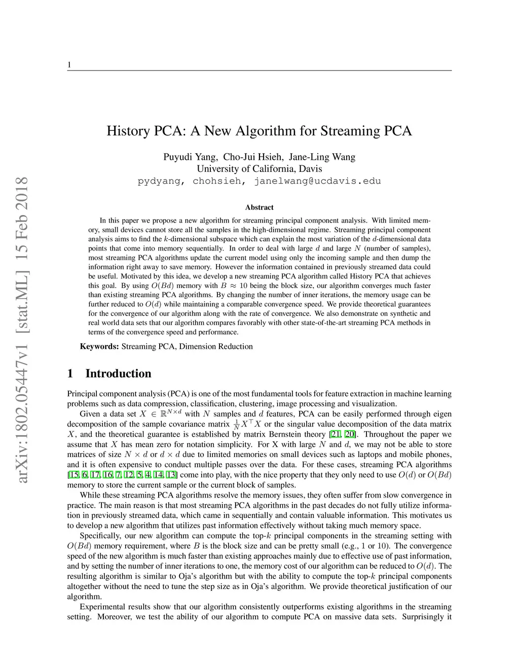 In this paper we propose a new algorithm for streaming principal component analysis. With limited memory, small devices cannot store all the samples in the high-dimensional regime. Streaming principal component analysis aims to find the -dimensional subspace which can explain the most variation of the -dimensional data points that come into memory sequentially. In order to deal with large and large (number of samples), most streaming PCA algorithms update the current model using only the incoming sample and then dump the information right away to save memory. However the information contained in previously streamed data could be useful. Motivated by this idea, we develop a new streaming PCA algorithm called History PCA that achieves this goal. By using memory with being the block size, our algorithm converges much faster than existing streaming PCA algorithms. By changing the number of inner iterations, the memory usage can be further reduced to while maintaining a comparable convergence speed. We provide theoretical guarantees for the convergence of our algorithm along with the rate of convergence. We also demonstrate on synthetic and real world data sets that our algorithm compares favorably with other state-of-the-art streaming PCA methods in terms of the convergence speed and performance.
