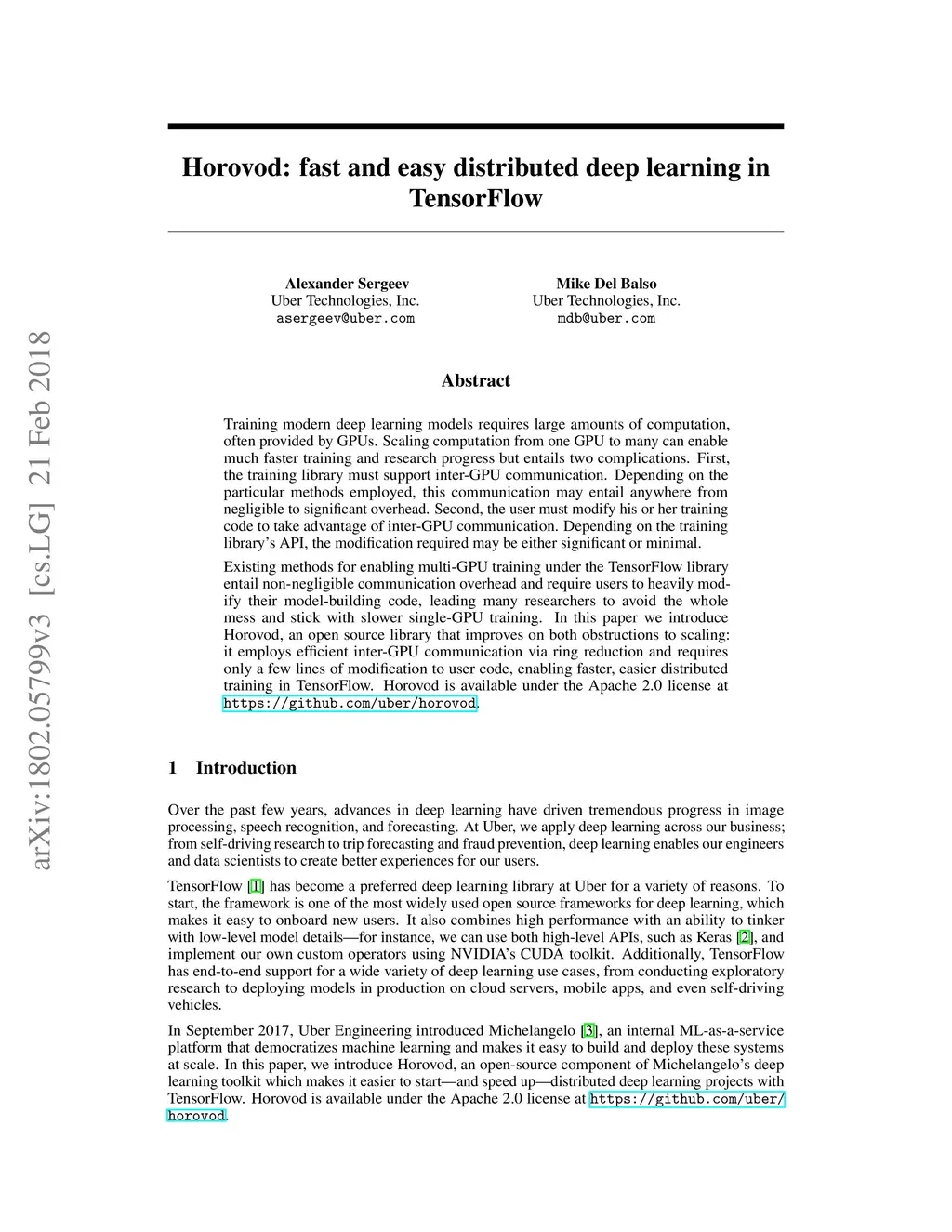 Horovod: fast and easy distributed deep learning in TensorFlow