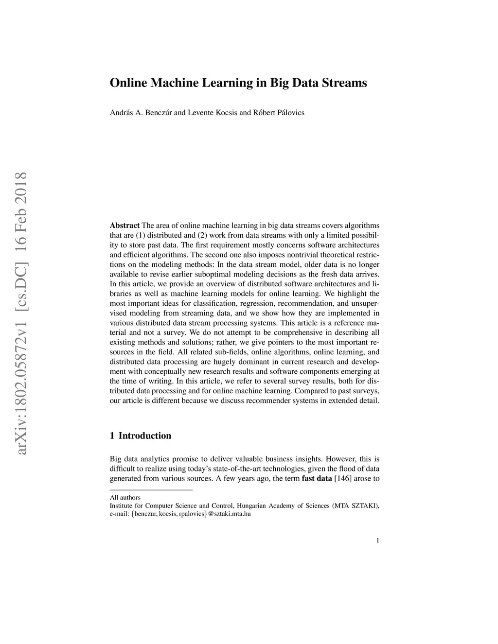 The area of online machine learning in big data streams covers algorithms that are (1) distributed and (2) work from data streams with only a limited possibility to store past data. The first requirement mostly concerns software architectures and efficient algorithms. The second one also imposes nontrivial theoretical restrictions on the modeling methods: In the data stream model, older data is no longer available to revise earlier suboptimal modeling decisions as the fresh data arrives. In this article, we provide an overview of distributed software architectures and libraries as well as machine learning models for online learning. We highlight the most important ideas for classification, regression, recommendation, and unsupervised modeling from streaming data, and we show how they are implemented in various distributed data stream processing systems. This article is a reference material and not a survey. We do not attempt to be comprehensive in describing all existing methods and solutions; rather, we give pointers to the most important resources in the field. All related sub-fields, online algorithms, online learning, and distributed data processing are hugely dominant in current research and development with conceptually new research results and software components emerging at the time of writing. In this article, we refer to several survey results, both for distributed data processing and for online machine learning. Compared to past surveys, our article is different because we discuss recommender systems in extended detail.